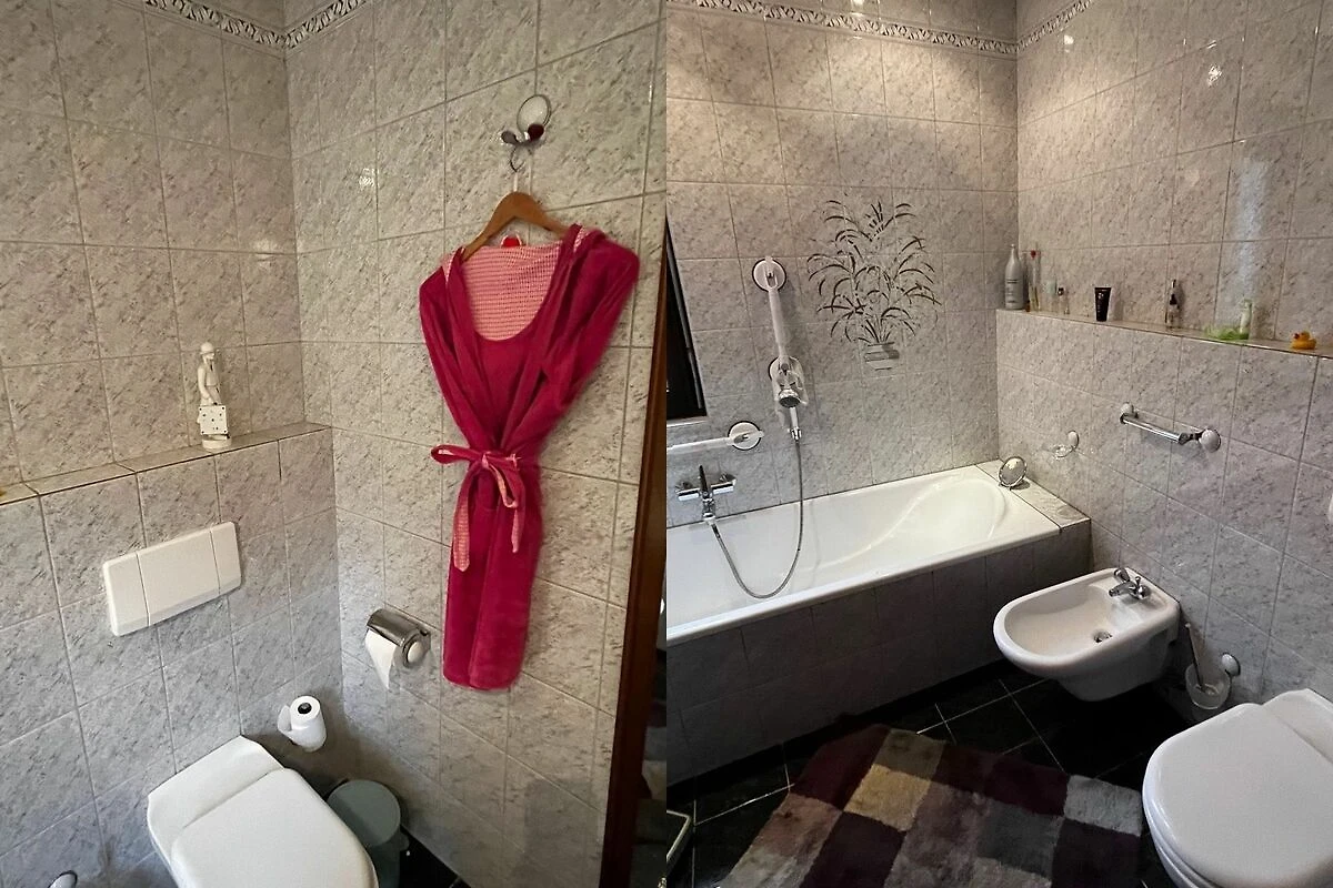 Eine Etage tiefer befindet sich ein weiteres Schlafzimmer mit einem französischen Doppelbett und ein zu diesem Schlafzimmer gehörenden zweiten Badezimmer mit Doppelwaschtisch, Toilette, PD und einer Dusche. Das Badezimmer und das Schlafzimmer verfügen natürlich auch über Aussenfenster.