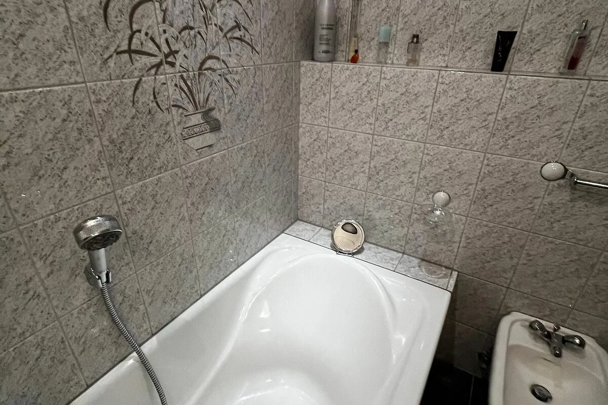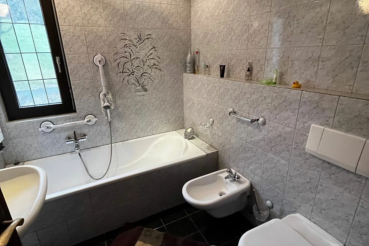 Dierekt neben dem Schlafzimmer liegt ihr helles Badezimmer mit Waschbecken, grossem Spiegel, PD, Toilette und einer weissen, einladenden Badewanne. Das Bad verfügt natürlich über ein Fenster und Hologenspots in der weissen Decke.