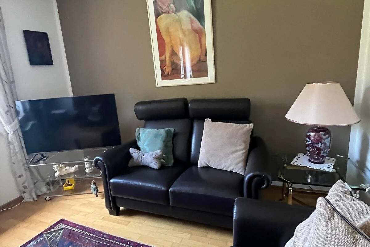 Gegenüber des Badezimmers betreten Sie das grosse und gemütliche Wohnzimmer mit LED.TV, einem Relaxsessel und 2 grossen Aussenfenstern mit Blick auf die Naturkulisse.