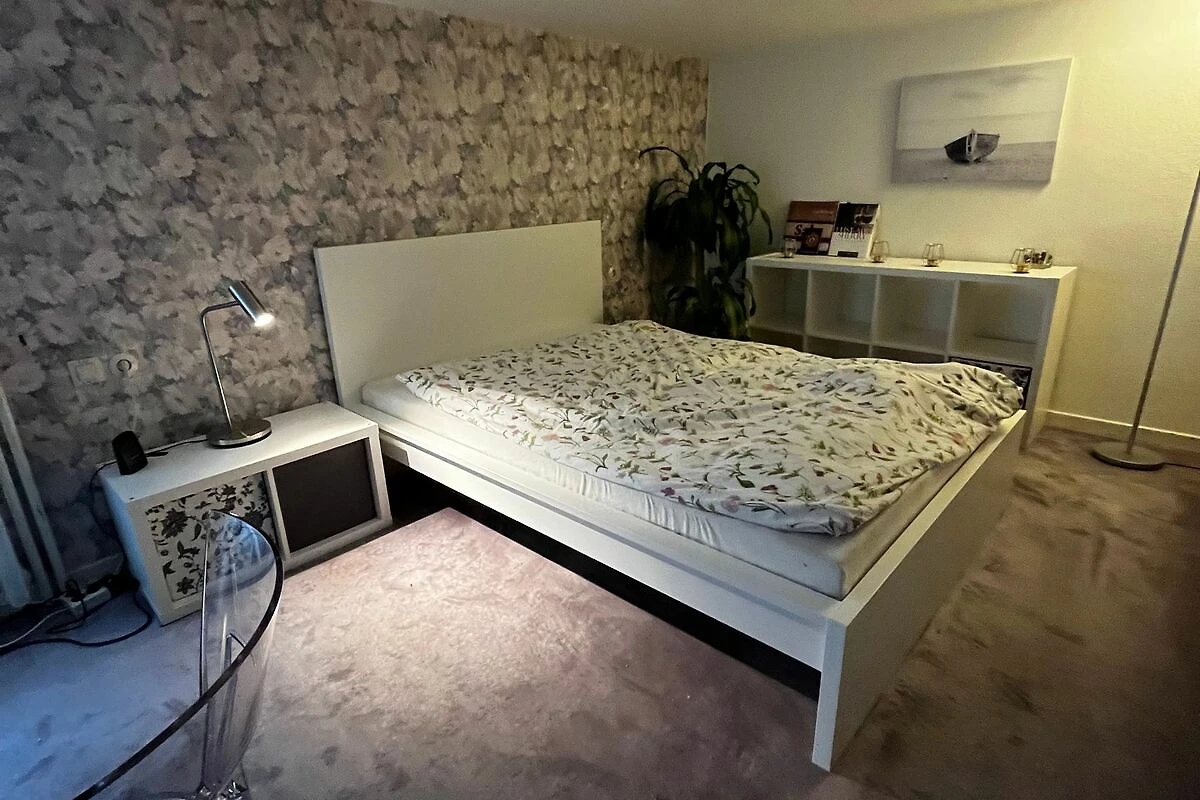 Auf dieser Etage befinden sich das mit einem Designermöbeln ausgestattete erste Schlafzimmer. Sie betreten es direkt von der Wohnduele aus.