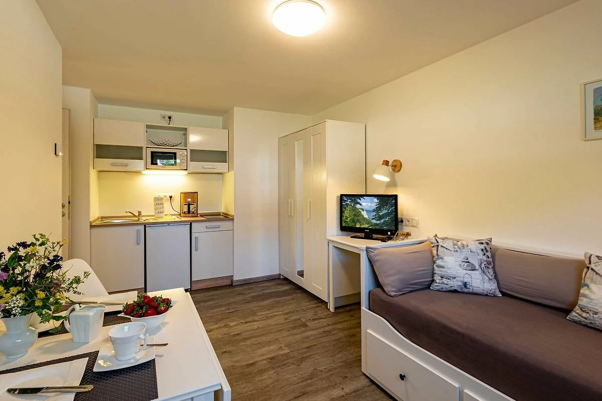 Im grossen Wohn-Schlafraum befinden sich ein bequemes Doppelbett mit Nachtschränken und Leselampen, Sitzgelegenheiten, ein Kleiderschrank sowie ein modernes Flachbild-TV-Gerät.Und verfügt über eine Fussbodenheizumg die eine angenehme Wohlfühlwärme ausstrahlt. Gegen Aufpreis je Gast liegen für Sie bei Ihre Anreise frische Handtücher bereit und die Betten bereits mit Bettwäsche bezogen. Die dritte Schlafmöglichkeit befindet sich im kombinierten Wohn/Schlafraum. Dieser ist ausgestattet mit einem Einzelbett und Leselampe sowie ein Kleiderschrank. Auch befindet sich hier ein Flachbild-TV-Gerät. Eine integrierte Miniküche ist hier ebenfalls vorhanden. Hier finden Sie alle Utensilien vor, um sich ein Essen bereiten zu können.