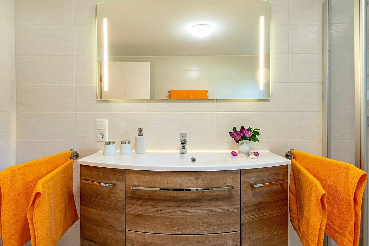 Das grosse Bad ist mit Dusche, WC und Waschtisch ausgestattet und verfügt über Tageslicht. Kurtaxe ist vor Ort zu zu entrichten. Dieses Appartment ist neu renoviert. Um die Abende ausklingen zu lassen finden Sie einen kleinen Aussenbereich mit Sitzgelegenheiten auf dem Grundstück vor.