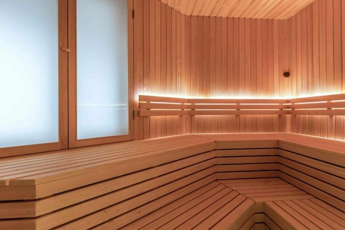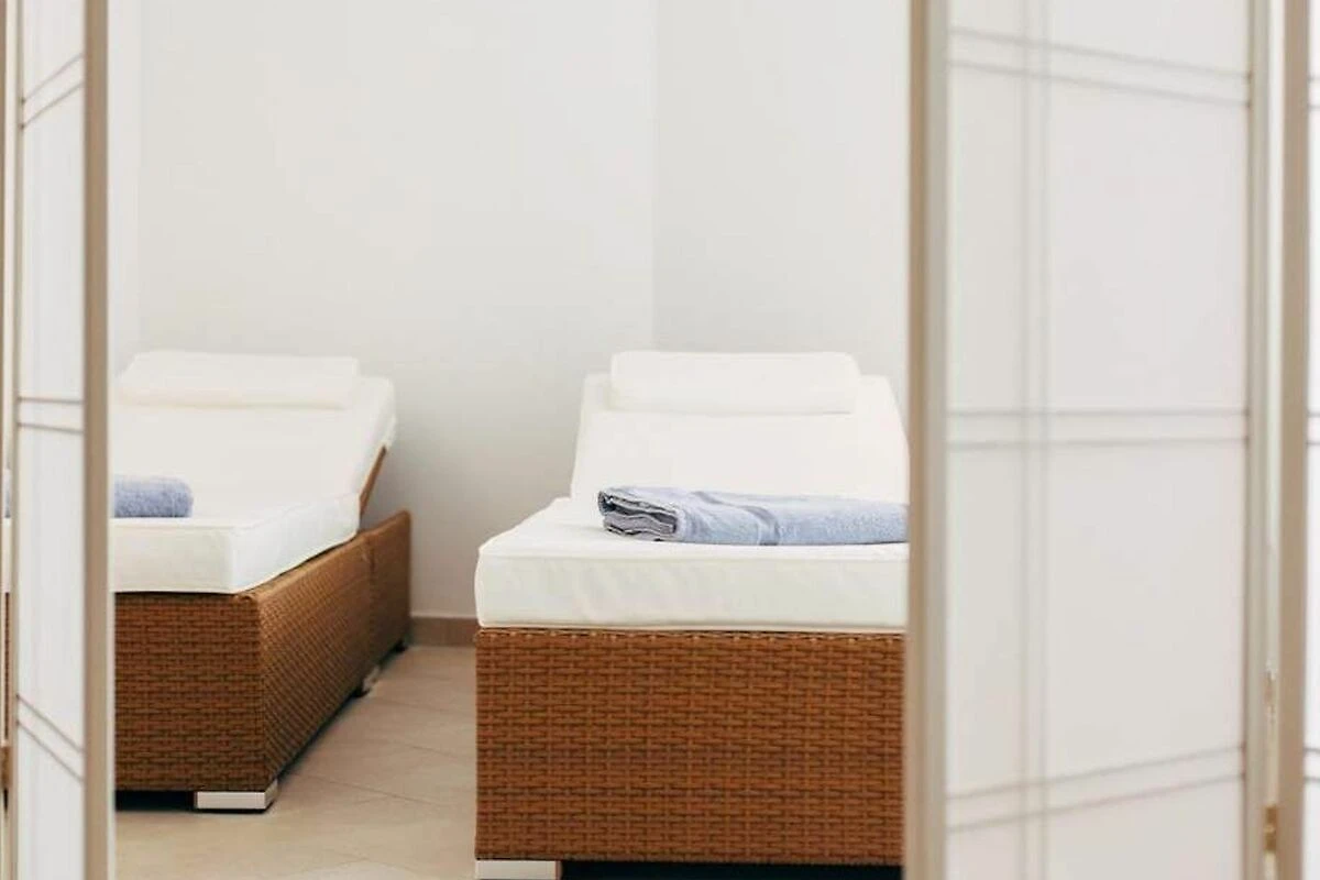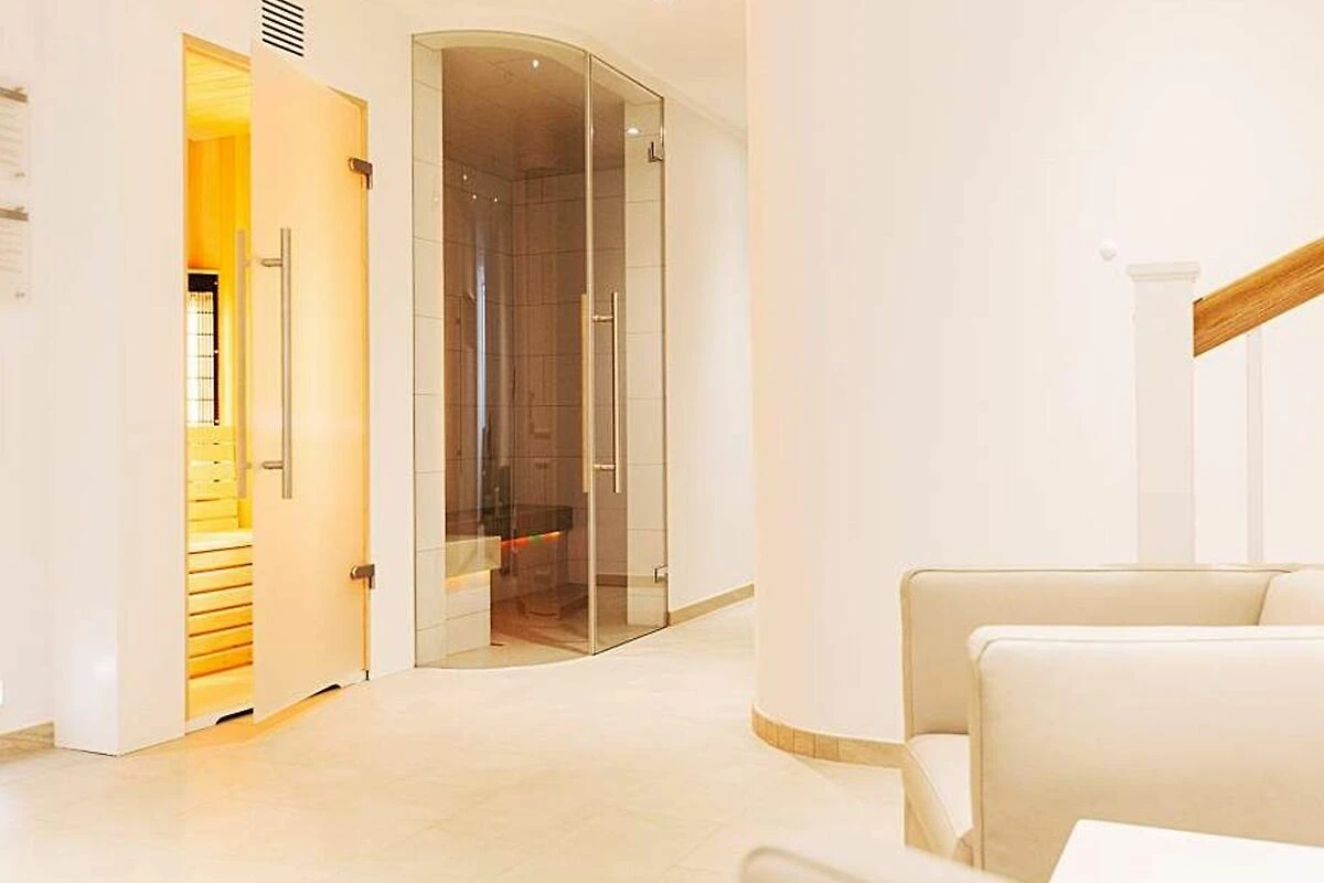 Vom Untergeschoss hat man direkten Zugang zum hauseigenen Wellness- und Fitnessbereich. Ein Wellnesspaket (bestehend aus 1 Bademantel, 1 Saunatuch, 1 Badetuch und 1 Paar Badeslipper) kann für 15,00 Euro/Paket mit gemietet werden.