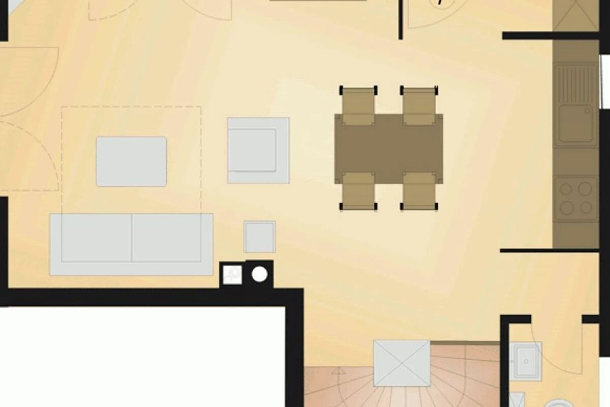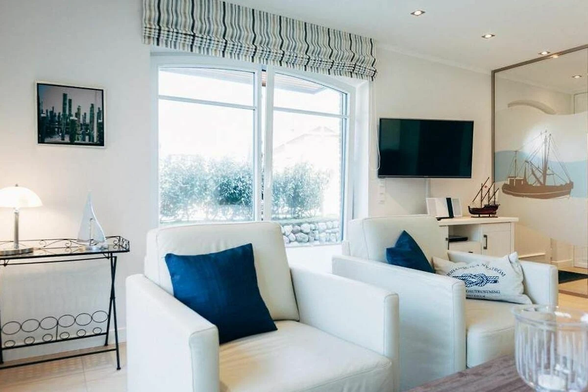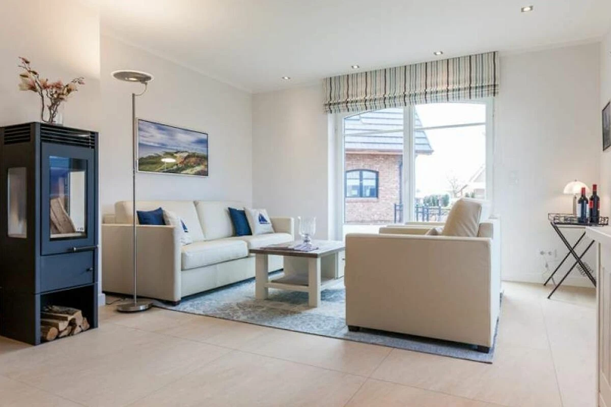 Luxuriöse 2-Zimmer-Maisonette-Nichtraucher-Ferienwohnung, ca. 68 qm, im Erdgeschoss mit eigenem Hauseingang, West- und Nordwestterrasse für 2 Personen gestattet. Im Erdgeschoss befindet sich das Wohnzimmer mit gemütlicher Ledercouchgarnitur (Sofa ausziehbar, 1,70 x 1,90 m), Kaminofen, Essbereich mit offener Küche, Zugang zur West- und Nordwestterrasse mit Strandkorb, sowie 1 Gäste-WC.