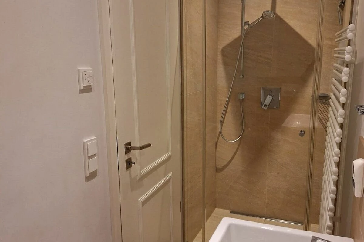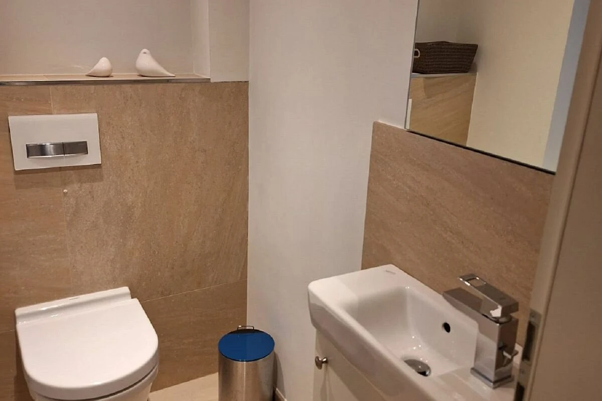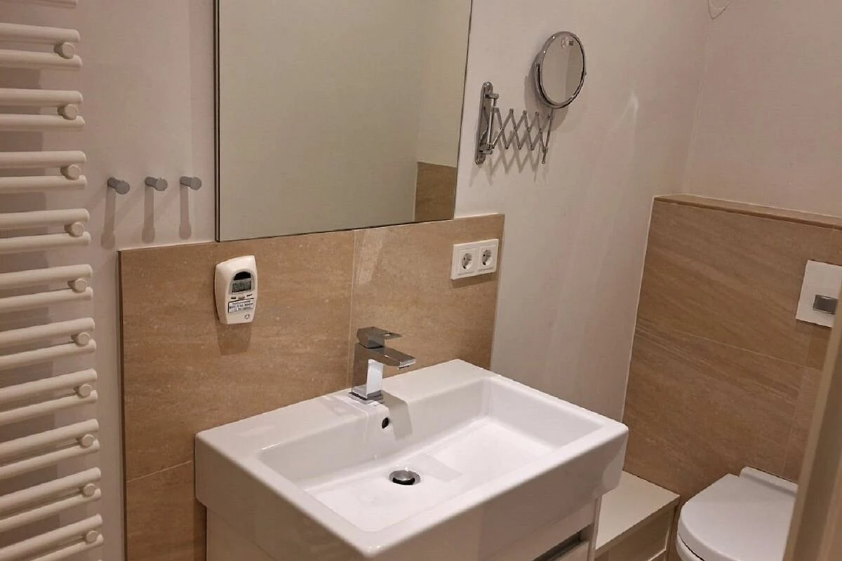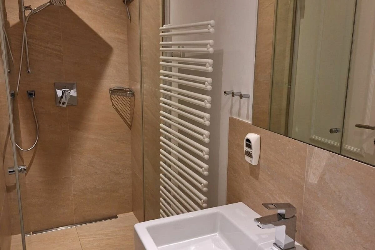 Das neue Bad lässt mit moderner Regendusche, Fön, Kosmetikspiegel, Waschtisch, Handtuchwärmer und WC keine Wünsche offen.