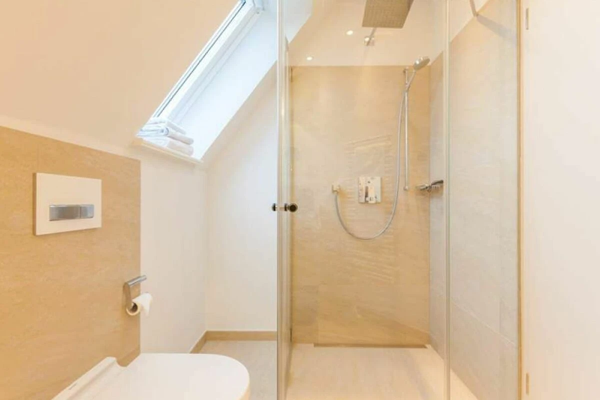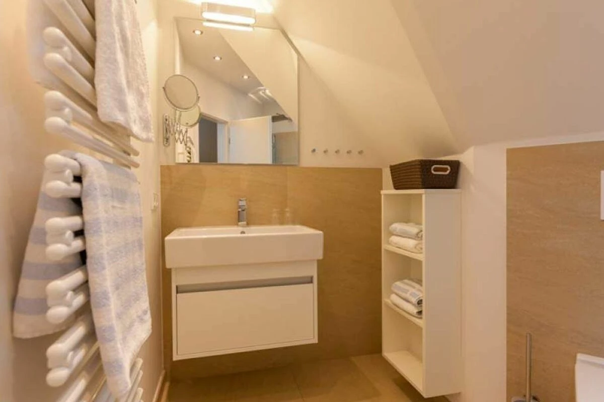 Das neue Bad lässt mit moderner Regendusche, Fön, Kosmetikspiegel, Waschtisch, Handtuchwärmer und WC keine Wünsche offen.
