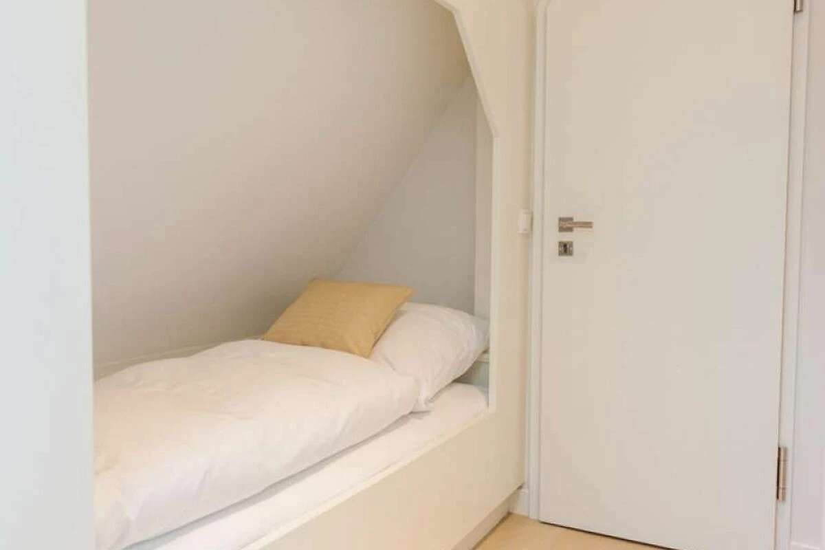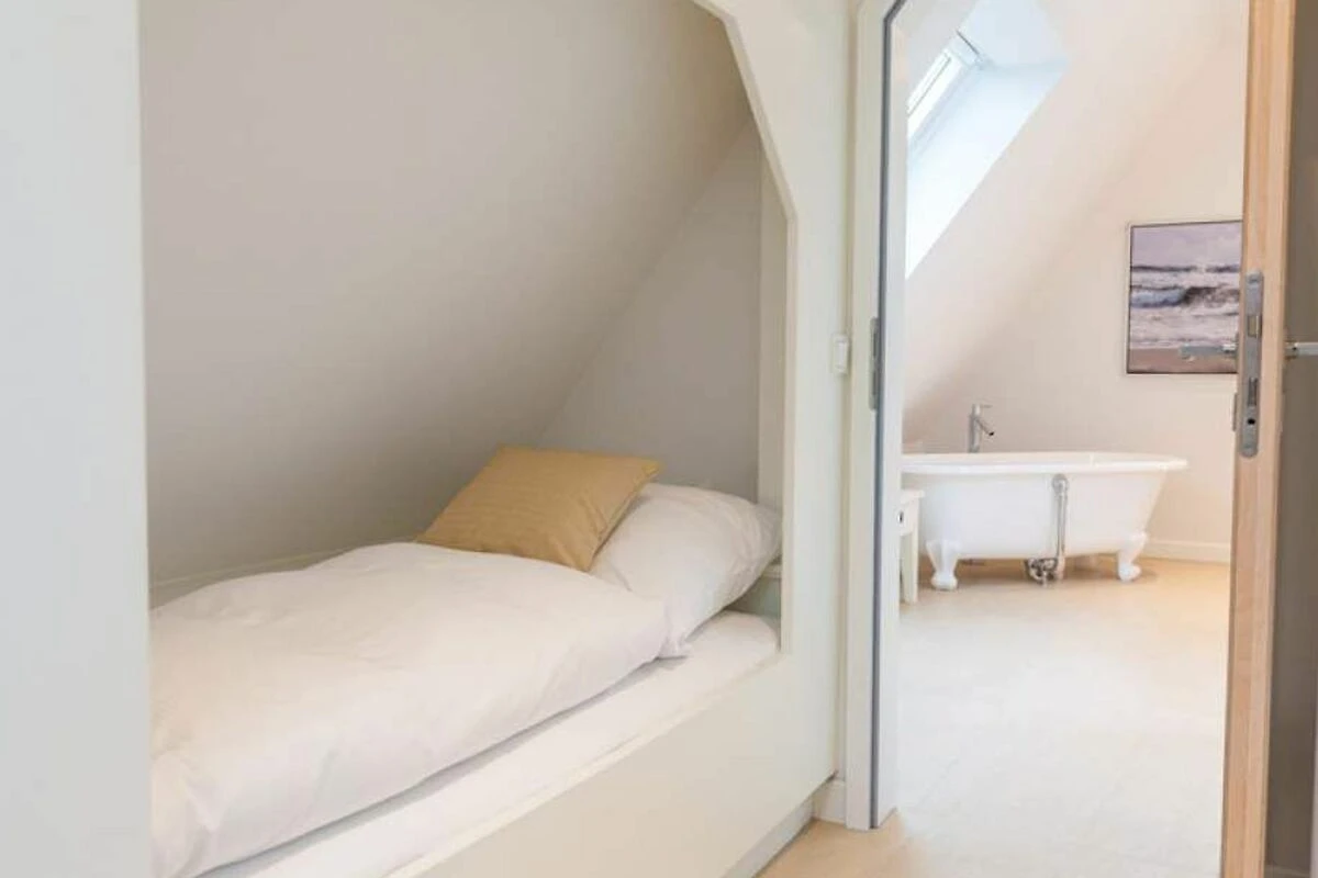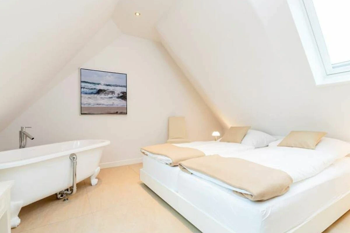 Im Dachgeschoss befindet sich ein geräumiges Doppel-Schlafzimmer mit Boxspringbett in optimaler Liegehöhe (Kinderzustellbett möglich), freistehender Designbadewanne und einem weiteren Flachbild-TV sowie eine offene Empore mit Einzel-Alkoven-Bett (Boxspringbett).