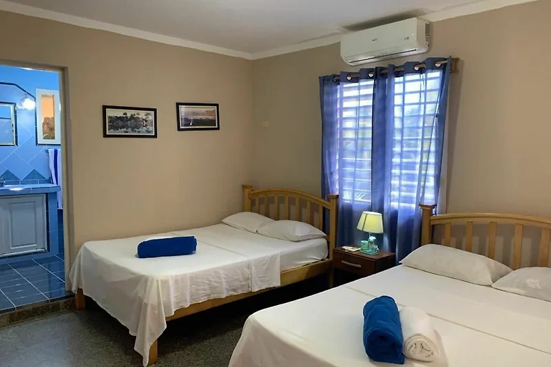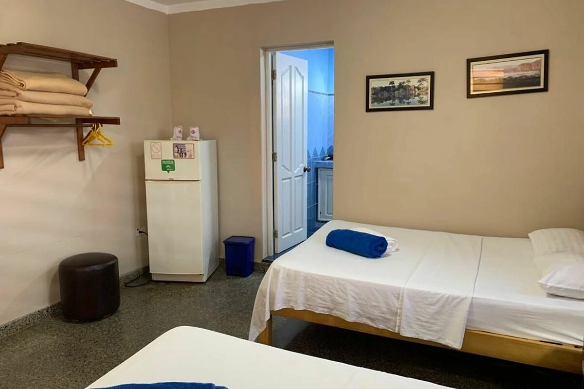 Das Zimmer in der Unterkunft Hostal Los Tres Caballeros bietet mit zwei Doppelbetten eine grosszügige Schlafmöglichkeit, ideal für Gruppen oder Familien. Moderne Annehmlichkeiten wie eine Klimaanlage und ein Kühlschrank sorgen für einen zeitgemässen Komfort. Zur Ausstattung gehören ebenfalls Bettwäsche und Handtücher, um den Aufenthalt für die Gäste angenehm zu gestalten.