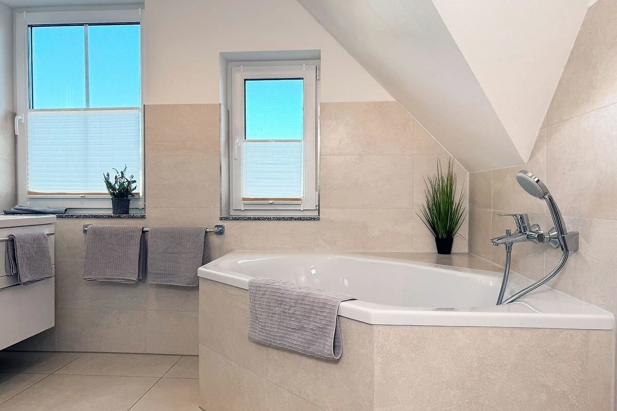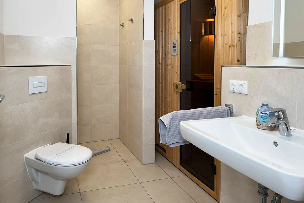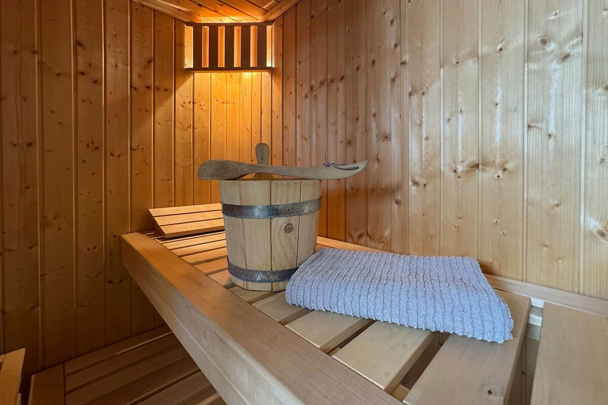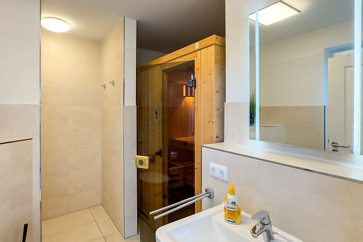 • Zwei Badezimmer: eines mit Badewanne und Dusche, eines mit Dusche und Sauna