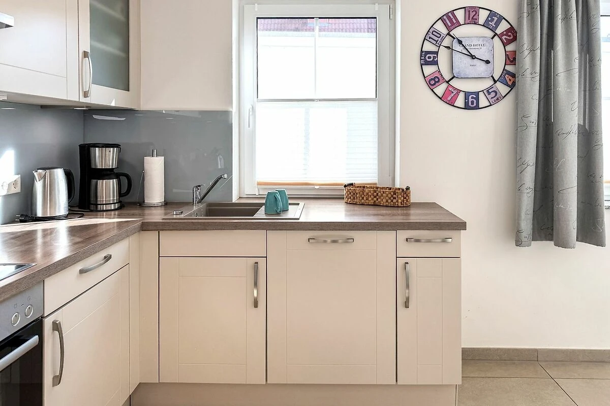 • Voll ausgestattete Küche mit Geschirrspüler, Backofen, Kochfeld, Kühlschrank, Mikrowelle, Filterkaffeemaschine, Toaster und Wasserkocher