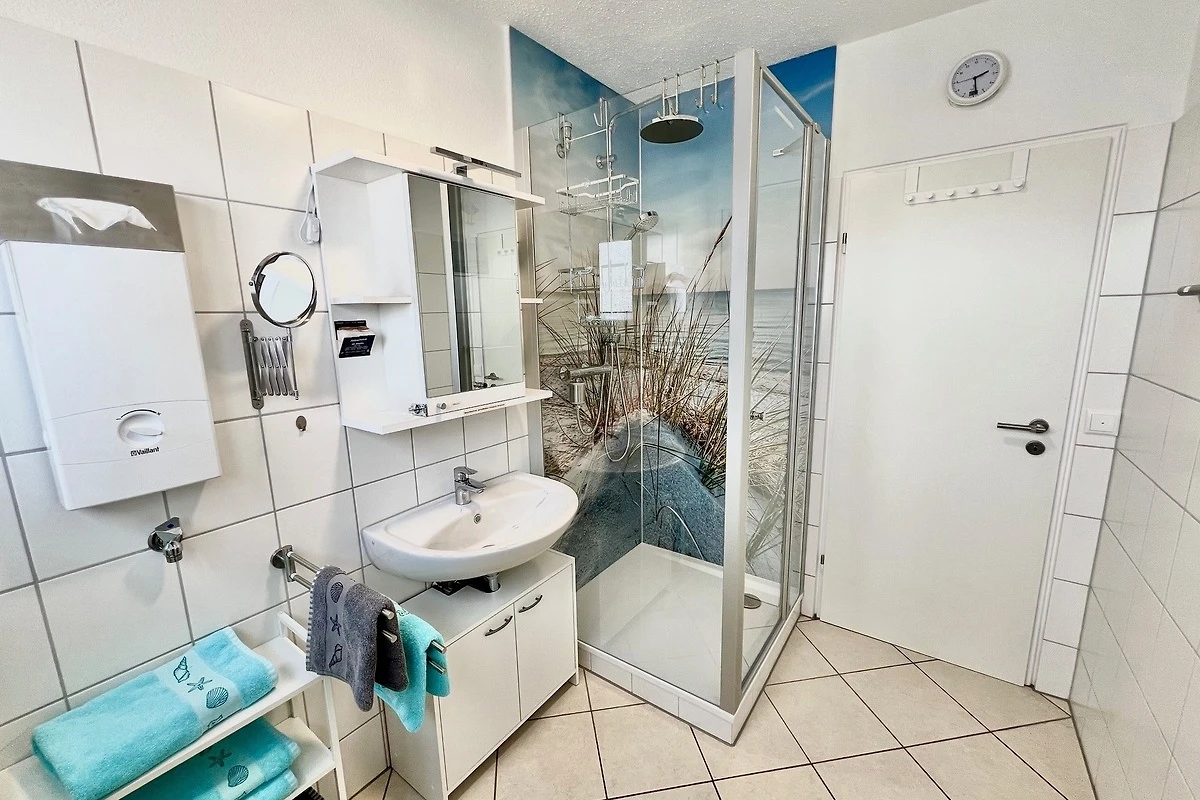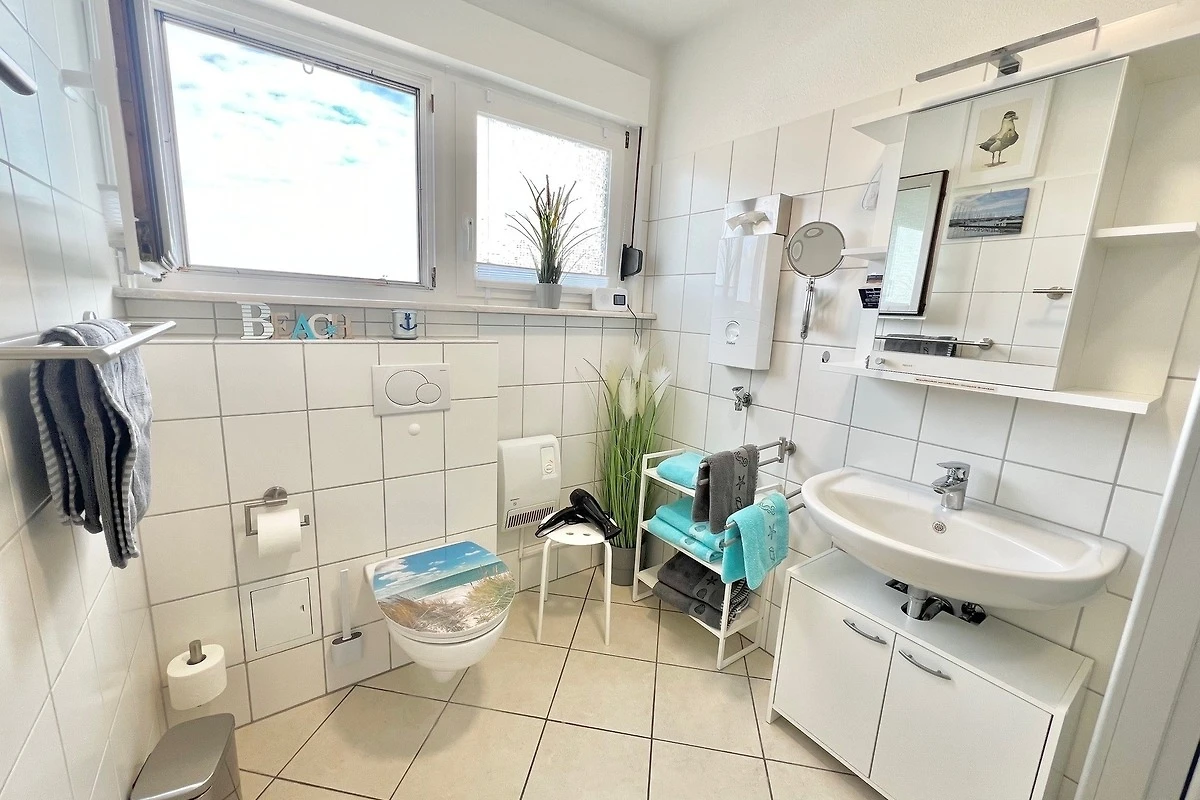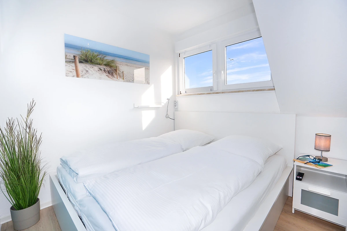 Das Schlafzimmer ist mit einem bequemen Doppelbett, Nachttischen, Kommode und einem Smart-TV ausgestattet. Im Tageslichtbad finden Sie neben einer Eckdusche ausreichend Ablageflächen vor.