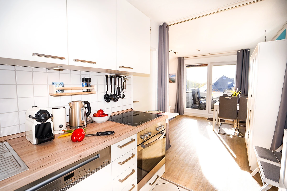 Die voll ausgestattete Küche verfügt über eine Spülmaschine, Backofen, Cerankochfeld und einen Kühlschrank mit Gefrierfach.