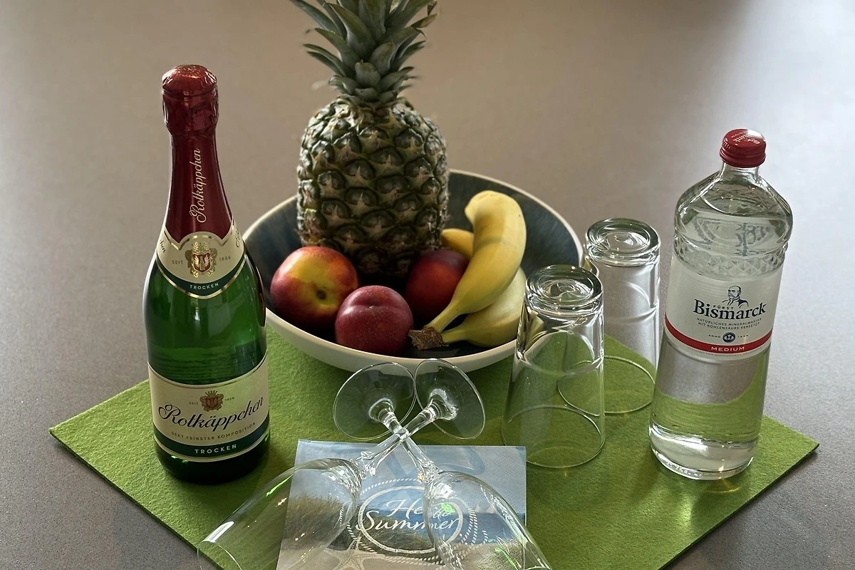 Als Willkommensgruss warten bei Anreise Sekt und Wasser auf Sie.
