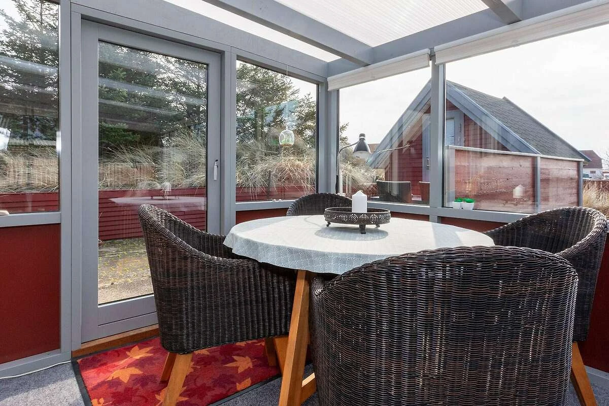 Der helle Wintergarten ist im Herbst sehr schön zu nutzen. Die uneinsichtige Terasse ist super. / Der Teppich gehört dringend erneuert. Schade, das gerade bei schlechtem Wetter der Fernseher nicht funktioniert.