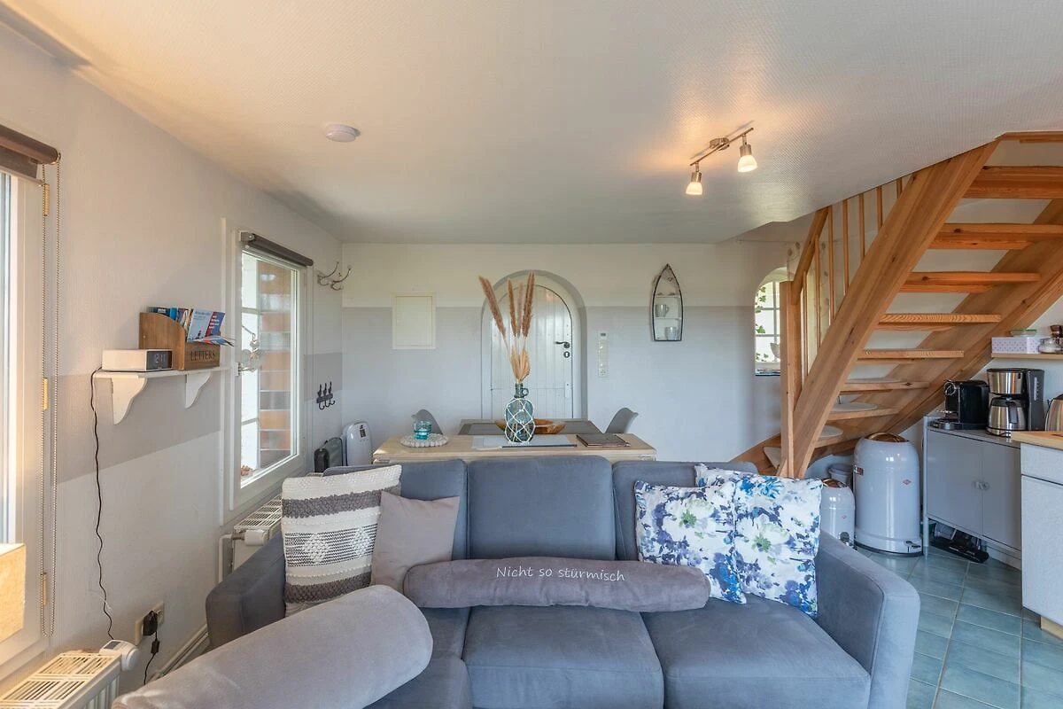 Das Apartment für zwei Personen erstreckt sich über 2 Etagen: im großen Wohnbereich finden Sie eine gemütliche Sitzecke mit Sofa, Flachbildschirm. Die offene Küchenzeile ist mit einem 2-Platten-Herd, einer Mikrowelle, Nespresso Maschine, Kaffeemaschine (Filtergröße 4) ausgestattet. Das Duschbad im Erdgeschoss rundet das Bild ab.