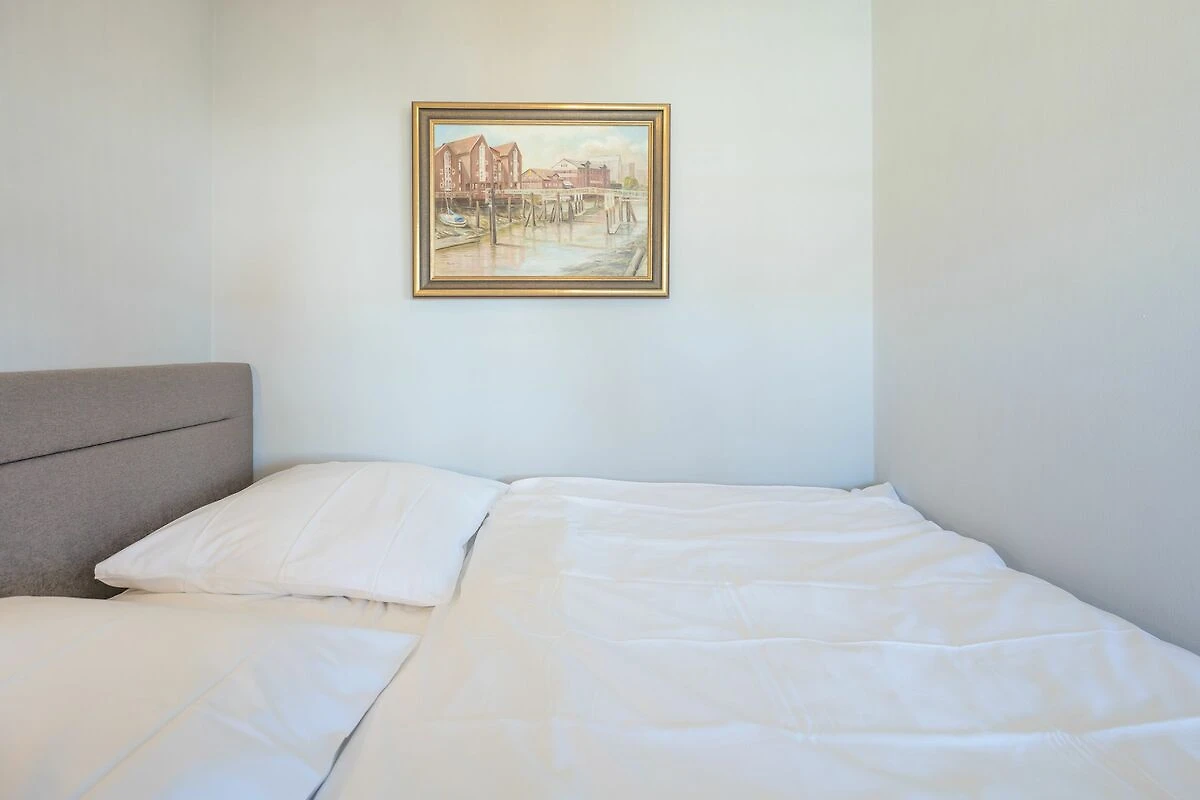 Die Studio-Wohnung ist modern eingerichtet: Ein Schlafzimmer mit einem Boxspring-Doppelbett (180 x 200) und eine offene und gut ausgestattete Einbauküche mit einem Ceranfeld, Backofen, Geschirrspülmaschine, Wasserkocher, Kaffeemaschine (Filtergröße 4). Der Wohnbereich verfügt über ein bequemes Sofa, einen Flachbild-TV und einen Essbereich. Das moderne Badezimmer ist mit einer Dusche, WC und Waschbecken eingerichtet. Genießen Sie den direkten Blick auf den Husumer Hafen.