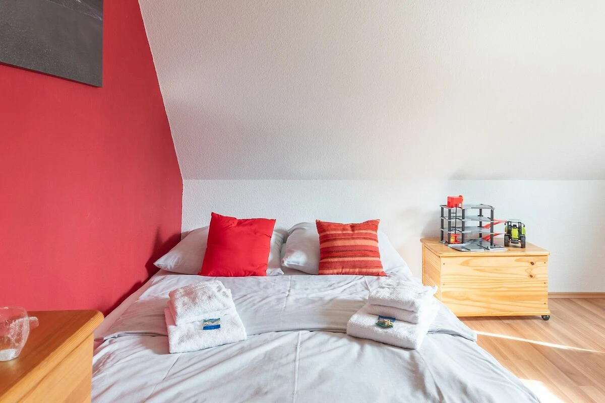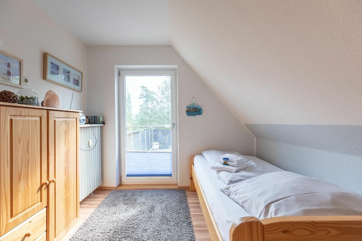 Die Unterkunft verfügt über drei Schlafzimmer: ein Schlafzimmer mit einem Boxspring-Doppelbett (180x200) und Kleiderschrank, ein weiteres mit einem Doppelbett (140x200) und ein weiteres mit einem Einzelbett. Die Betten sind bei Ihrer Ankunft liebevoll bezogen. Von hier aus haben Sie Zugang zu dem großen Balkon, auf dem Sie an dem großen Esstisch in der Familienrunde frühstücken oder aber gemütlich im Strandkorb ein Buch lesen können.