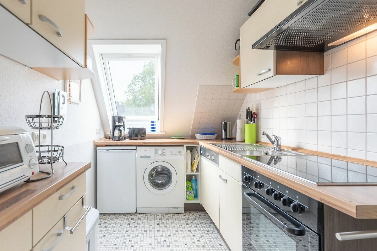 Zur Wohnung gehört eine separate Küche, die sehr gut ausgestattet ist: Geschirrspüler, Kühlschrank, Gefrierfach, Backofen, Ceranfeld mit 4 Kochplatten, Dunstabzugshaube, Filterkaffee-Maschine (Filtergröße 4), Wasserkocher und ein Toaster.