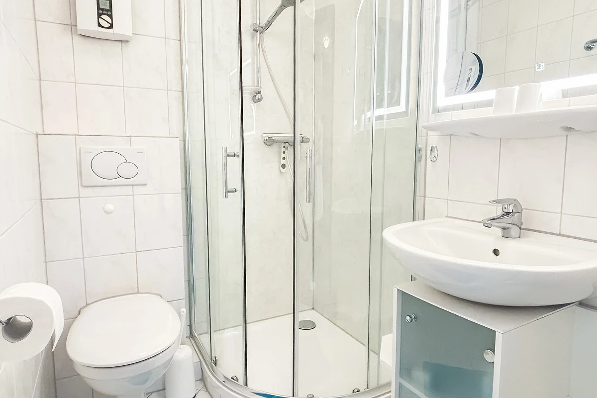 Das hell gefliestes Duschbad ist mit Eckdusche/ Glastrennwand, Waschbecken & WC ausgestattet.