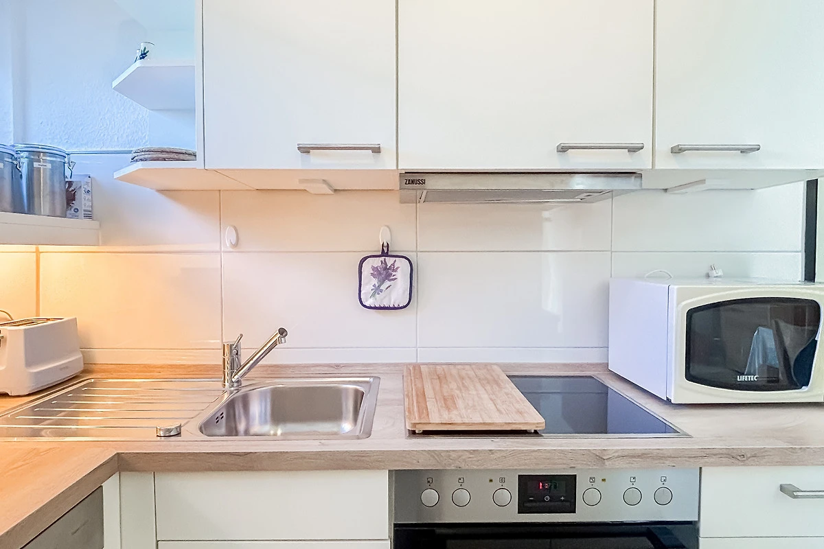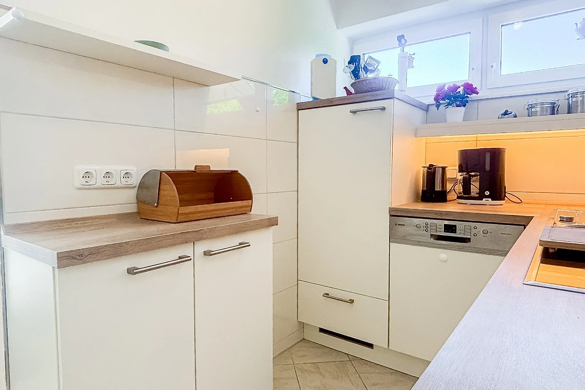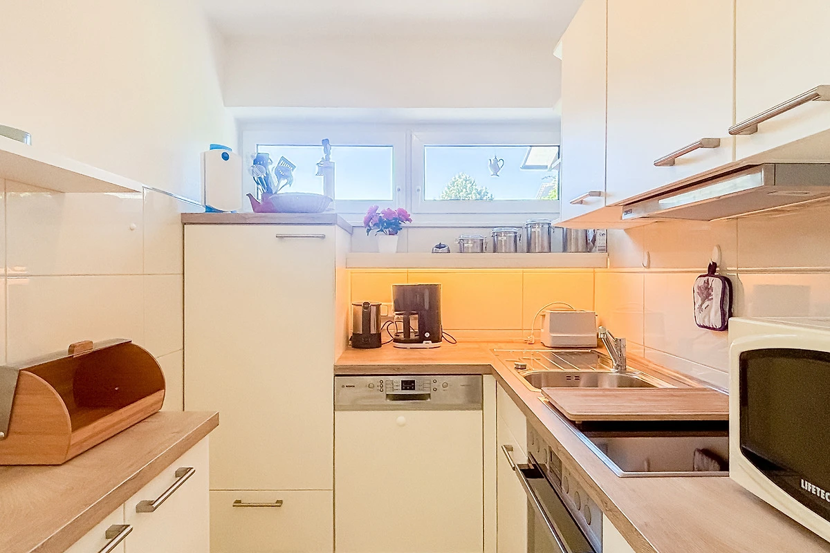 Die Küche ist mit Herd, Backofen, Mikrowelle, Geschirrspüler, Kühlschrank mit Gefrierfach sowie allen üblichen Küchengeräten sehr gut eingerichtet.