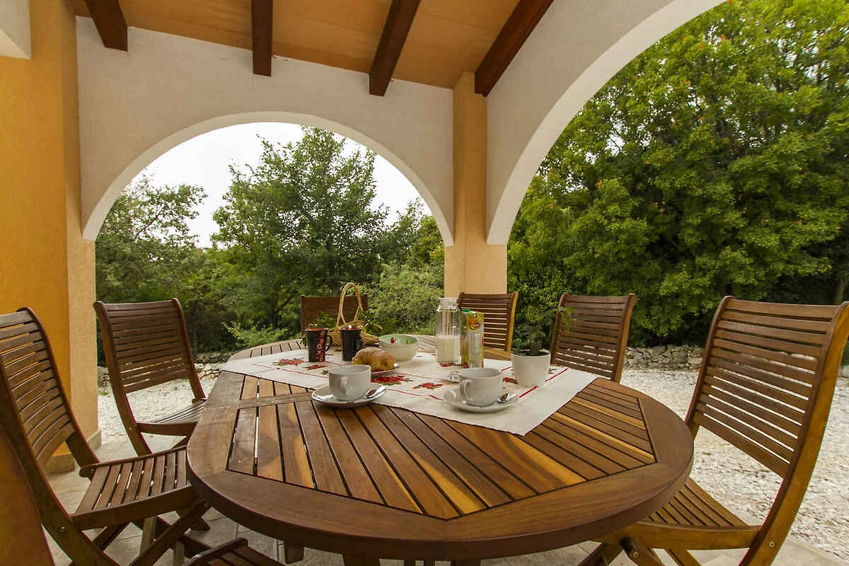 Koromačno. Die Ferienwohnung befindet sich auf einem 260 qm grossen, geschlossenen Gartengrundstück mit Blumen und Bäumen, von einem Zaun begrenzt. Der Vermieter wohnt nicht im Haus oder auf dem Grundstück. Die Zufahrt erfolgt über eine Bergstrasse (asphaltiert). Parkplatz auf dem Grundstück.