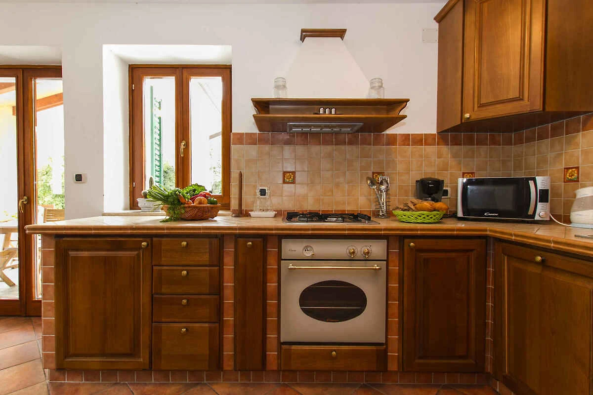 Erdgeschoss: Wohnzimmer mit Sitzecke, TV und Kamin. Schlafzimmer mit 1 Doppelbett. Küche mit Essecke, Elektroherd (4 Platten), Backofen, Dunstabzugshaube, Kühlschrank, Mikrowelle, Kaffeemaschine und elektrischem Wasserkocher. Bad mit Badewanne, 1 Waschbecken, WC, Bidet und Fenster.
