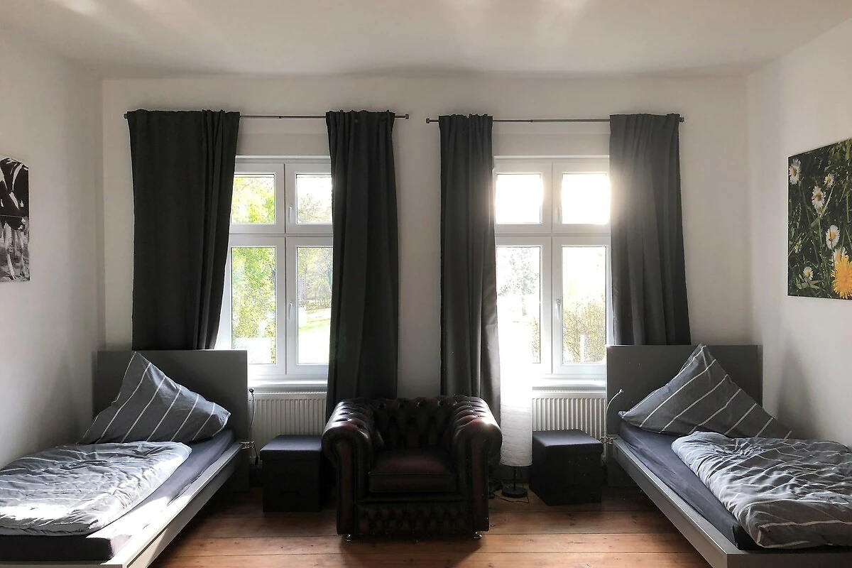 Diese grosse Ferienwohnung eignet sich hervorragend zur Unterbringung von kleinen Gruppen. Sie hat drei Zimmer, zwei davon je 20 qm gross mit jeweils 3 Betten und ein Zimmer mit 2 Betten. Im Jahr 2021 vollständig renoviert, verfügt Sie über neue Elektrik und Heizkörper sowie ein Duschbad. Die alten Kachelöfen haben wir als Relikt stehen lassen. Der Blick aus der Küche in den Hof zeigt eine bunte Hühnerschar und ländlichen Charme vergangener Zeiten, denn der Gutsherrenhof stand viele Jahre leer und wurde bislang nur notdürftig erhalten. Wer Wert auf innere Werte legt, ist hier bestens untergebracht!