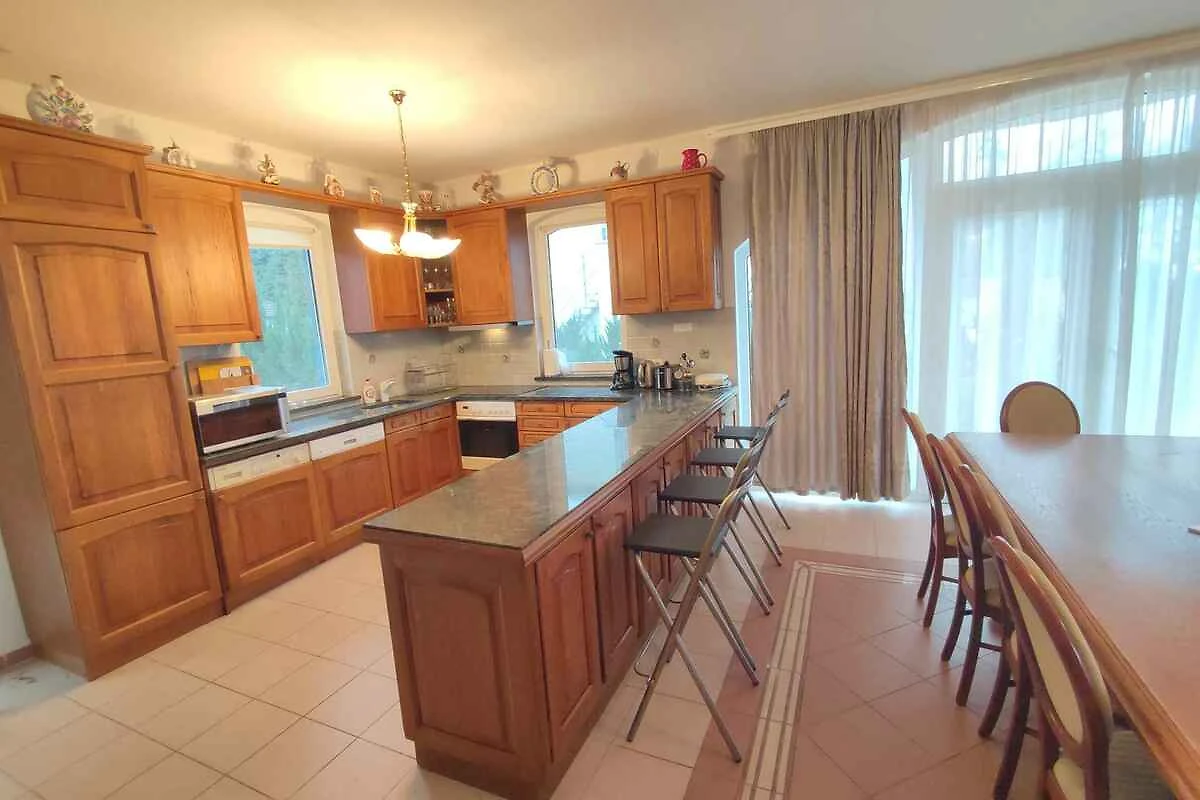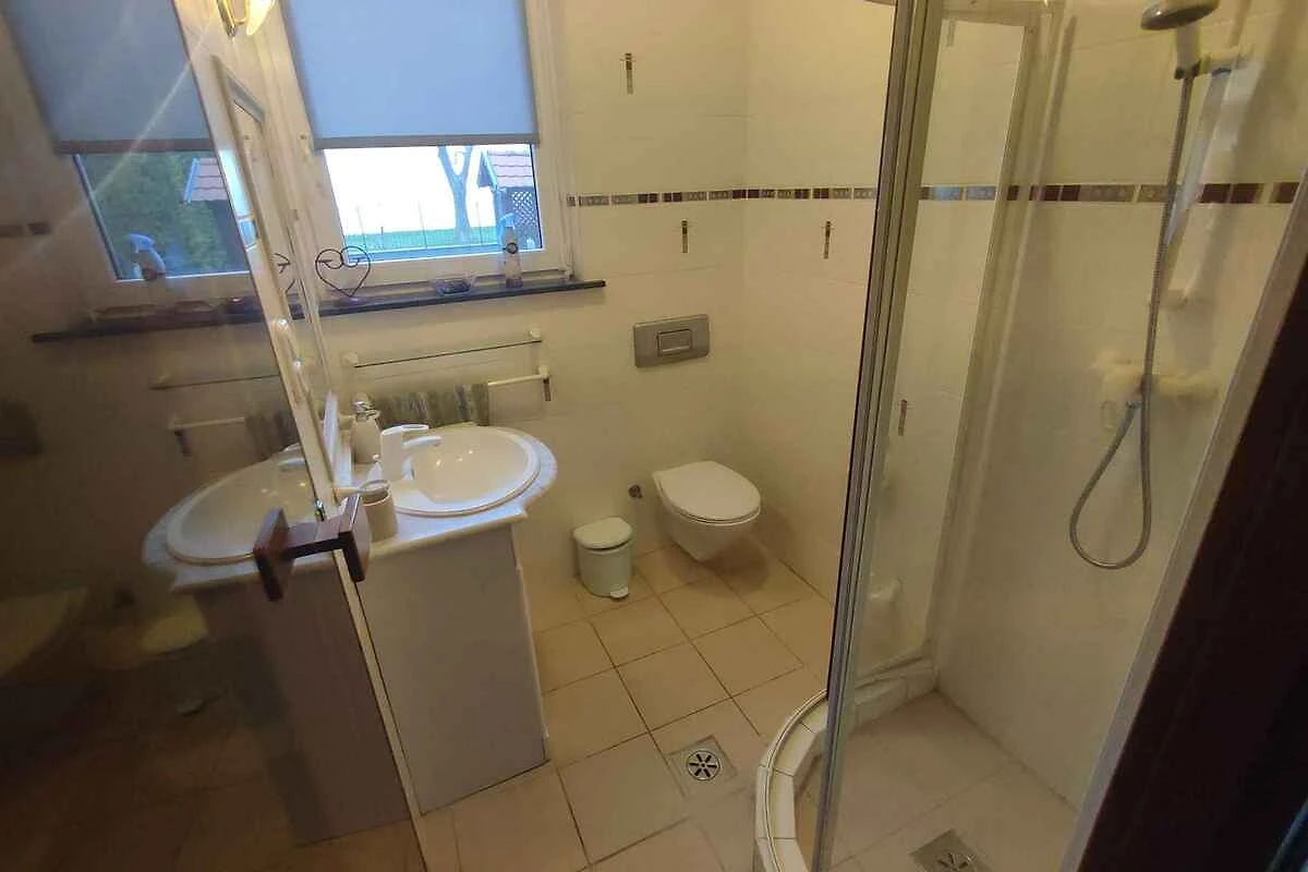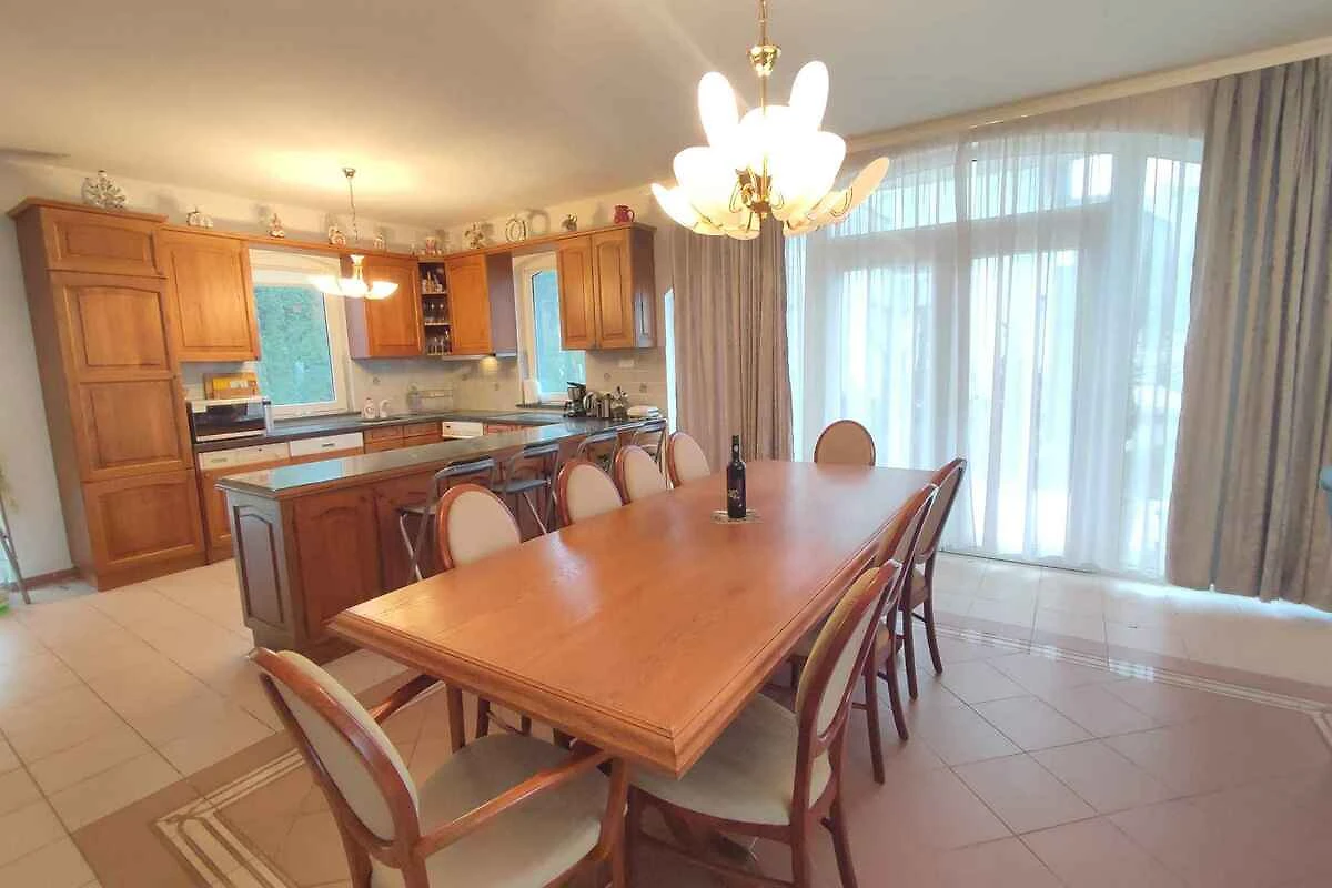 Erdgeschoss: Wohnzimmer (35 qm) mit TV, Kachelofen, Essecke (10 Plätze) und Zugang zur Terrasse. Amerikanische Küche mit Elektroherd (Induktionsherd, 4 Platten), Backofen, Dunstabzugshaube, Geschirrspüler, Kühlschrank (150 l, Eisfach), Mikrowelle, Kaffeemaschine, Toaster und elektrischem Wasserkocher. Bad mit Dusche, 1 Waschbecken, WC und Fenster.