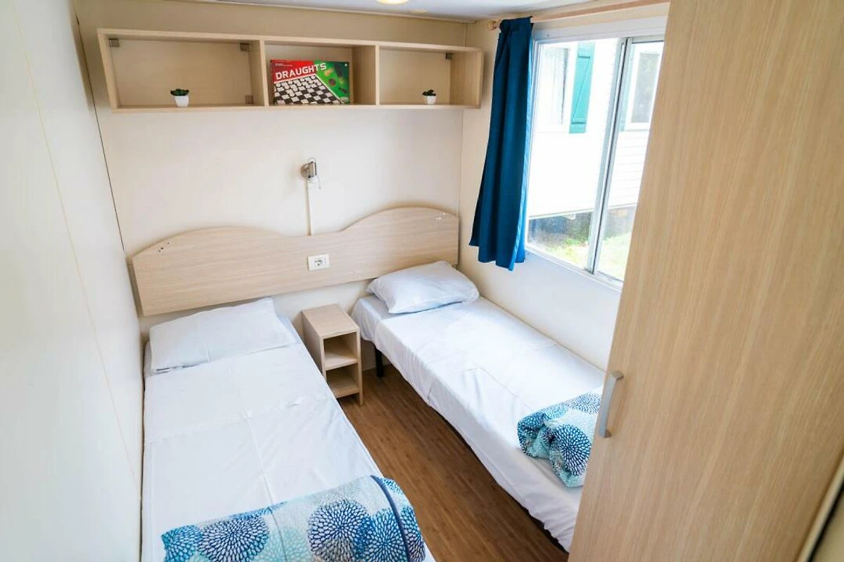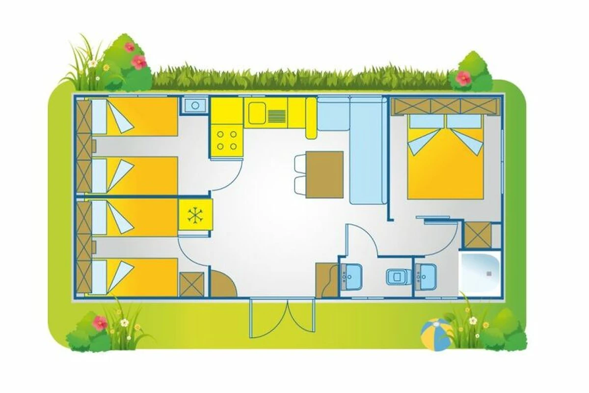 Die Unterkunft Happy Plus bietet Platz für 7 Personen. Das Mobilehome ist mit drei Schlafzimmern ausgestattet. Eines mit Doppelbett (190 x 140 cm) und zwei mit 2 Einzelbetten (190 x 70 cm). Für eine weitere Person gibt es im Wohnzimmer eine Schlafgelegenheit. Ein Wohnzimmer und eine offene Küche mit 4-Flammen-Gasherd, Dunstabzugshaube, Kühlschrank und Eisfach gehören zur Ausstattung des Mobilehome Happy Plus. Eine italienische Espressokanne ist vorhanden. Das Mobilhome verfügt über ein Badezimmer mit Dusche und Waschbecken sowie ein separates WC. Alle Räume verfügen über Steckdosen und alle Schlafzimmerfenster haben Moskitonetze. Die halbüberdachte Holzterrasse mit Tisch, Stühlen, 2 Liegen/Liegestühle und einer elektrischen Grillplatte lädt zum Entspannen ein, während die Kinder sich auf dem Spielplatz austoben. Auf Wunsch kann auch vor Ort Halb- oder Vollpension dazu gebucht werden. Hinweis: Wenn Sie mehr als eine Unterkunft benötigen, ist dies bei uns in der Regel möglich, da wir über mehrere Objekte des gleichen Haustyps verfügen.