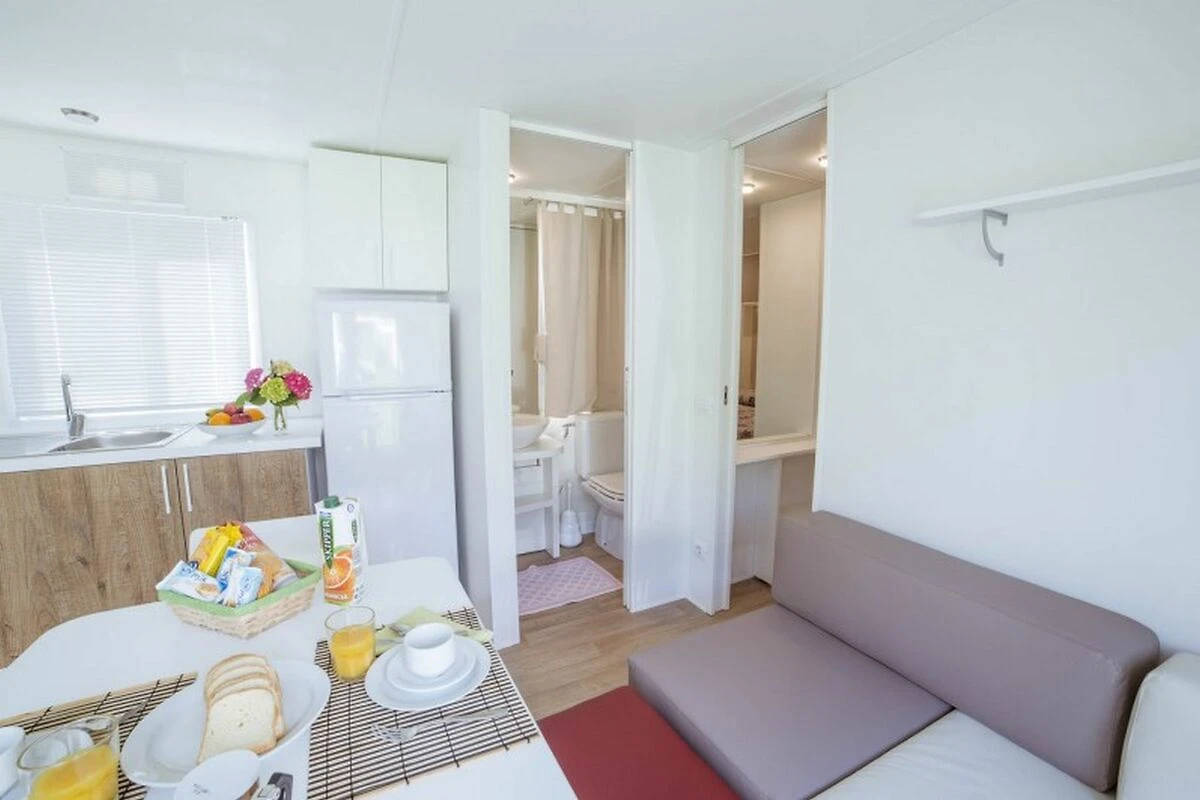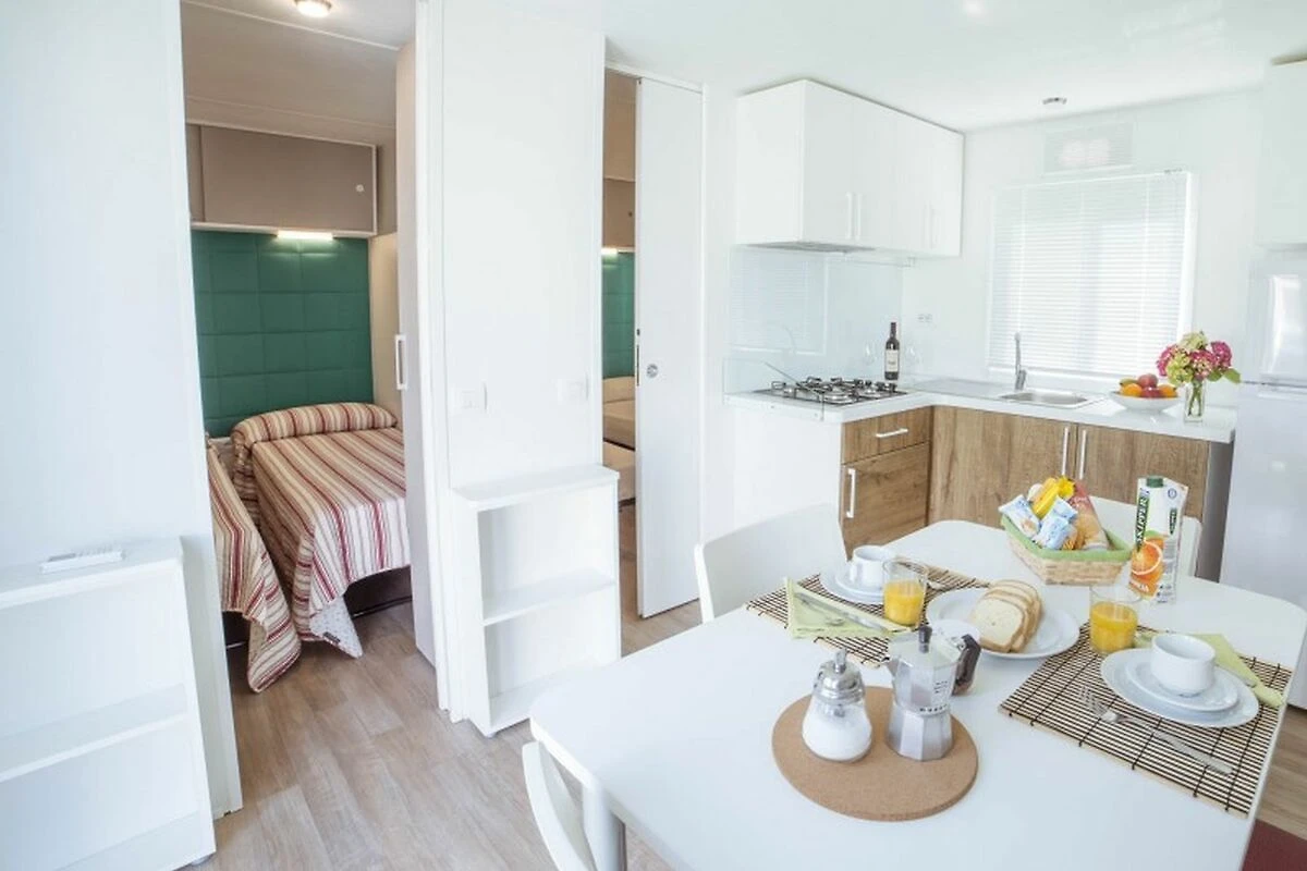 Das helle und freundlich eingerichtete Mobilehome 4F-M3 bietet Platz für max. 4 Personen. Die Unterkunft besteht aus einem Schlafzimmer mit Doppelbett sowie einem Schlafzimmer mit zwei Einzelbetten. Im Wohnbereich befindet sich die gut eingerichtete Küche mit Geschirr, Besteck, Töpfen, einem Gasherd, einer italienischen Espressokanne sowie einem Kühlschrank mit Eisfach. Das Badezimmer verfügt über eine Dusche, ein WC und ein Waschbecken. Der mit einem Zeltdach überdachte Sitzplatz mit Tisch und Stühlen und der kleine Garten laden zum gemütlichen Entspannen ein, während sich die Kinder auf dem Spielplatz oder am Pool austoben können. Die Fahrzeit ab der ital. Grenze beträgt ca. 2h. Hinweis: Wenn Sie mehr als eine Unterkunft benötigen, ist dies bei uns in der Regel möglich, da wir über mehrere Objekte des gleichen Haustyps verfügen.