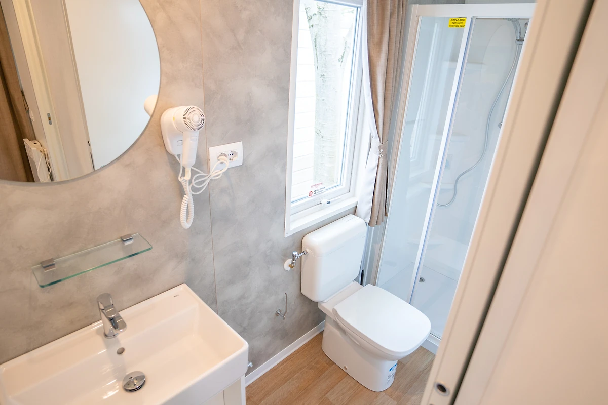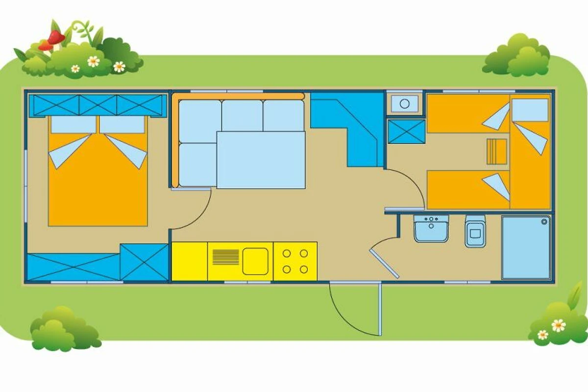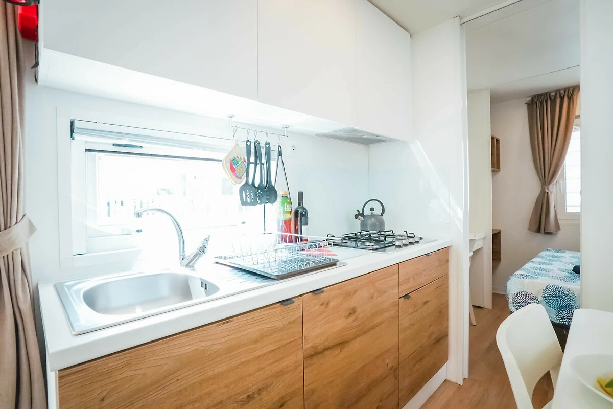 Das helle und geräumige Mobilehome Happy Relax verfügt über eine moderne Einrichtung und eine einladende Atmosphäre. Sie werden sich wie zu Hause fühlen. Das Mobilehome bietet Platz für max. 6 Personen (davon mind. 1 Kind bis max. 12 Jahre/60kg) und ist aufgeteilt in ein Schlafzimmer mit Doppelbett (190 x 140 cm) und ein Schlafzimmer mit 2 Einzelbetten (190 x 70 cm) und einem Klappbett (für eine Person bis maximal 150 cm Grösse bzw. 60 kg). Eine weitere Schlafgelegenheit ist im Wohnzimmer (Bank zum Ausklappen). Die Küchenzeile verfügt über einen grossen Kühlschrank, 4-Flammen-Gasherd, Steckdosen und alles Notwendige für 6 Personen, vom Kochtopf bis zum Geschirr. Eine italienische Espressokanne ist vorhanden. Das Bad ist ausgestattet mit Dusche, WC und Waschbecken. An allen Schlafzimmerfenstern sind Moskitonetze vorhanden. Der Aussensitzplatz mit halbüberdachter Holzterrasse verfügt über Tisch, Stühle und 2 Liegen lädt zum Entspannen ein, während die Kinder sich auf dem Spielplatz austoben. Eine elektrische Grillplatte ist vorhanden. Auf Wunsch kann auch vor Ort Halb- oder Vollpension dazu gebucht werden. Hinweis Wenn Sie mehr als eine Unterkunft benötigen, ist dies bei uns in der Regel möglich, da wir über mehrere Objekte des gleichen Haustyps verfügen.