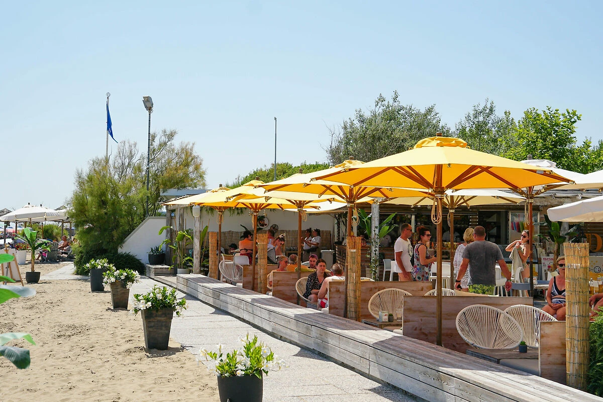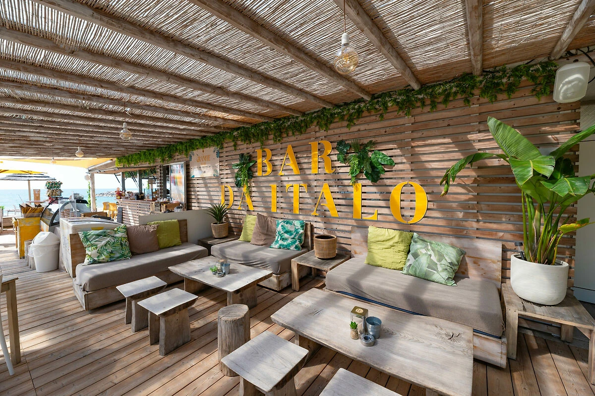 Es erwartet Sie ein wunderschöner, voll ausgestatteter Strand mit bequemen Liegestühlen und Sonnenschirmen für ein entspanntes Sonnenbad. Stillen Sie Ihren Durst mit einem Erfrischungsgetränk oder verspeisen Sie ein „Gelato“, während Sie den Sonnenuntergang geniessen.