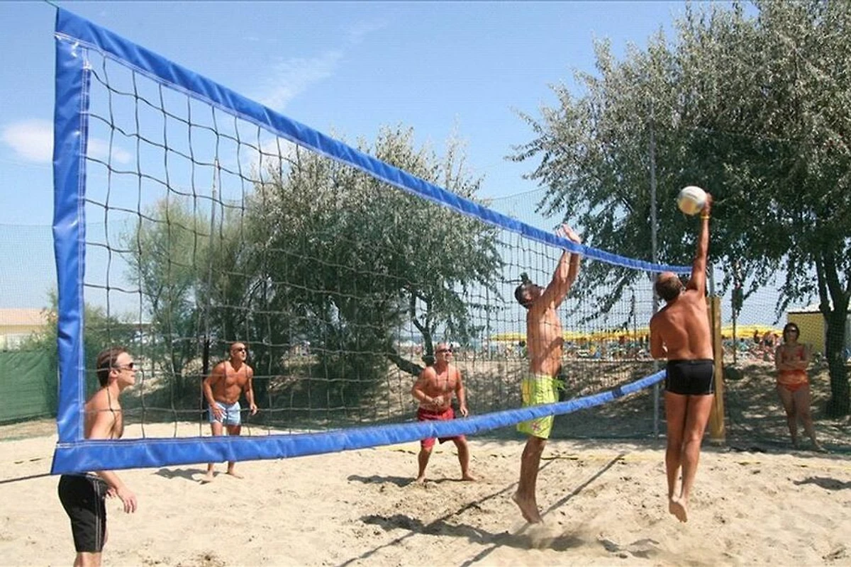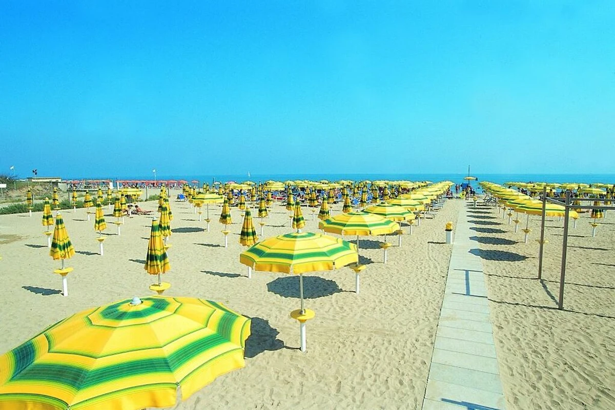 Der Ferienpark grenzt unmittelbar an den Sandstrand und ist somit für Familien mit Kindern sehr ideal. Auch der breite flachabfallende Sandstrand machen das Baden sehr angenehm. Am Strand hat es Toiletten und Duschen. Für die Verpflegung zwischendurch stehen Restaurants und Bars/Gelateria zur Verfügung. Neben einem grossen freien Sandstrand gibt es auch die Möglichkeit Liegen und Sonnenschirmen zu mieten.