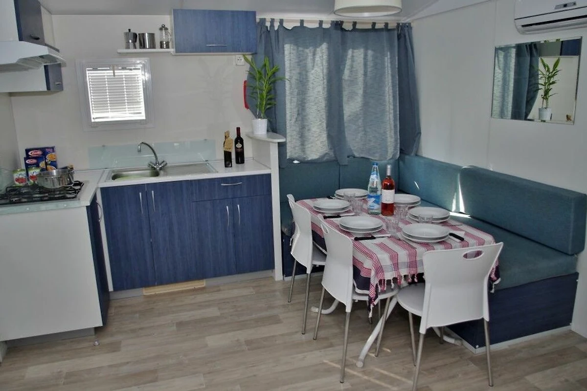 Die Unterkunft Happy Plus bietet Platz für 7 Personen. Das Mobilhome ist mit drei Schlafzimmern ausgestattet. Eines mit Doppelbett (190 x 140 cm) und zwei mit 2 Einzelbetten (190 x 70 cm). Für eine Person gibt es im Wohnzimmer eine Schlafgelegenheit. Das Mobilehome verfügt über ein Wohnzimmer und eine offene Küche mit 4-Flammen-Gasherd, Dunstabzugshaube, Kühlschrank und Eisfach. Eine italienische Espressokanne ist vorhanden. Das Mobilhome verfügt über ein Badezimmer mit Dusche und Waschbecken sowie ein separates WC. Alle Räume verfügen über Steckdosen und alle Schlafzimmerfenster haben Moskitonetze. Die halbüberdachte Holzterrasse mit Tisch, Stühlen, 2 Liegen/Liegestühle und einer elektrischen Grillplatte lädt zum Entspannen ein, während die Kinder sich auf dem Spielplatz austoben. Auf Wunsch kann auch vor Ort Halb- oder Vollpension dazu gebucht werden. Hinweis Wenn Sie mehr als eine Unterkunft benötigen, ist dies bei uns in der Regel möglich, da wir über mehrere Objekte des gleichen Haustyps verfügen.