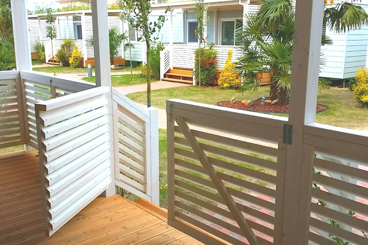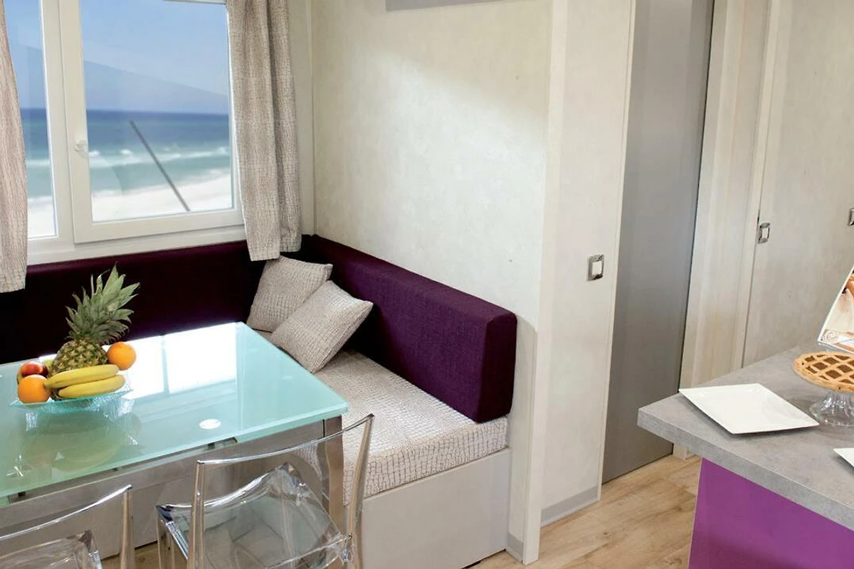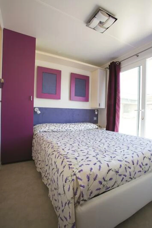 Das grosszügige und moderne Mobilehome bietet Platz für bis zu 6 Personen und verfügt über drei Schlafzimmer: ein Schlafzimmer mit Doppelbett sowie zwei Kinderzimmer, jeweils mit zwei Einzelbetten. Der Wohnbereich ist offen gestaltet und mit einem SAT-TV und Klimaanlage ausgestattet. Die Küche ist gut ausgestattet und umfasst Pfannen, Geschirr, Besteck, ein Herd einen grossen Kühlschrank mit Gefrierfach, eine Mikrowelle und eine Geschirrspülmaschine. Das Mobilehome verfügt über zwei Badezimmer: eines ist mit WC, Waschbecken und Bidet ausgestattet, während das zweite ein WC, eine Dusche und ein Waschbecken bietet. Die grossen Glasschiebetüren (180 cm breit) im Wohnbereich schaffen einen fliessenden Übergang zur überdachten Terrasse, die mit einem Tisch und Stühlen ausgestattet ist und zum Entspannen einlädt. Für Kinder gibt es einen Spielplatz, auf dem sie sich austoben können. Die Fahrzeit ab der italienischen Grenze beträgt ca. 3 Stunden. Wenn Sie mehr als eine Unterkunft benötigen, ist dies in der Regel möglich, da wir über mehrere Objekte des gleichen Haustyps verfügen.