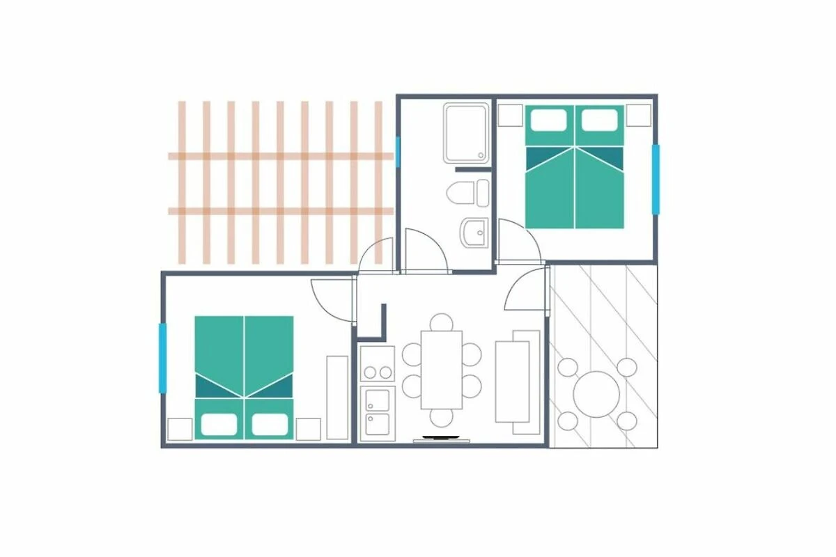 Die Unterkunft Holiday Home für max. 4 Personen besteht aus einem Elternschlafzimmer mit Doppelbett, welches sich auch in zwei Einzelbetten trennen lässt, sowie einem Schlafzimmer mit zwei Einzelbetten. Die gut eingerichtete Küche befindet sich im Wohnbereich und verfügt über Geschirr, Besteck und Pfannen sowie Kühlschrank mit Eisfach. TV vorhanden. Die Unterkunft hat zudem einen Safe. Das Badezimmer verfügt über eine Dusche sowie Waschbecken und WC. Die überdachte Terrasse mit Tisch und Stühlen lädt zum gemütlichen Entspannen ein, während die Kinder sich auf dem Spielplatz oder am Pool austoben können. Grillen erlaubt. Fahrzeit ab kroatischer Grenze ca. 5.5h. Hinweis Wenn Sie mehr als eine Unterkunft benötigen, ist dies bei uns in der Regel möglich, da wir über mehrere Objekte des gleichen Haustyps verfügen.