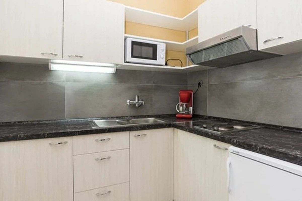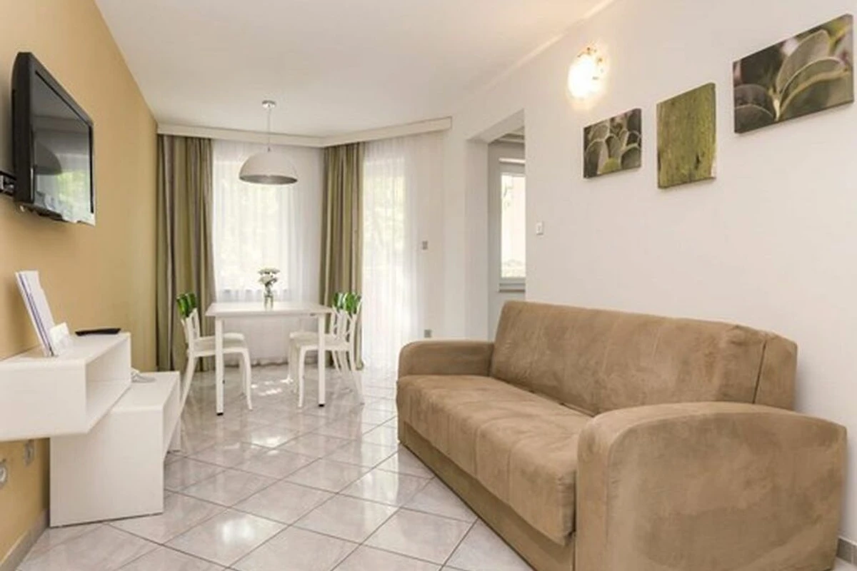 Die Wohnung Sirena Classic bietet Platz für max. 4 Personen und befindet sich im ersten oder zweiten Stockwerk. Sie verfügt über ein Schlafzimmer mit einem Doppel- oder zwei Einzelbetten. Zwei weitere Schlafplätze bietet das Bettsofa im Wohnzimmer. Im Wohnzimmer befindet sich auch ein LCD TV. Die Wohnung hat eine gut eingerichtete Küchenecke, welche über einen Herd, Geschirr, Besteck, Kochtöpfe, Mikrowelle sowie über einen Kühlschrank verfügt. Das Badezimmer ist mit einer Badewanne, einem WC, Haartrockner und einem Waschbecken ausgestattet. Der Balkon mit Tisch, Stühlen lädt zum Entspannen ein, während die Kinder sich auf dem Spielplatz oder am Pool austoben können. Fahrzeit ab kroatischer Grenze ca. 3h. Hinweis: Wenn Sie mehr als eine Unterkunft benötigen, ist dies bei uns in der Regel möglich, da wir über mehrere Objekte des gleichen Haustyps verfügen.