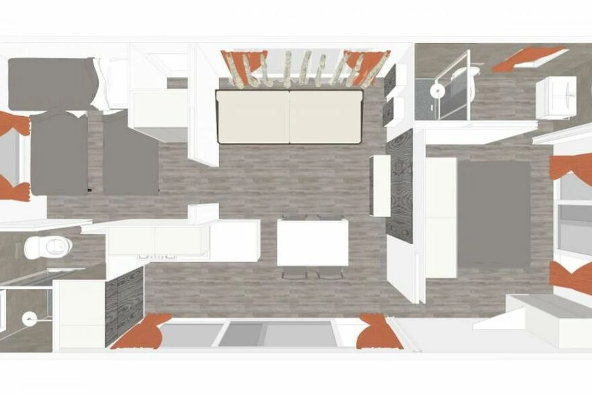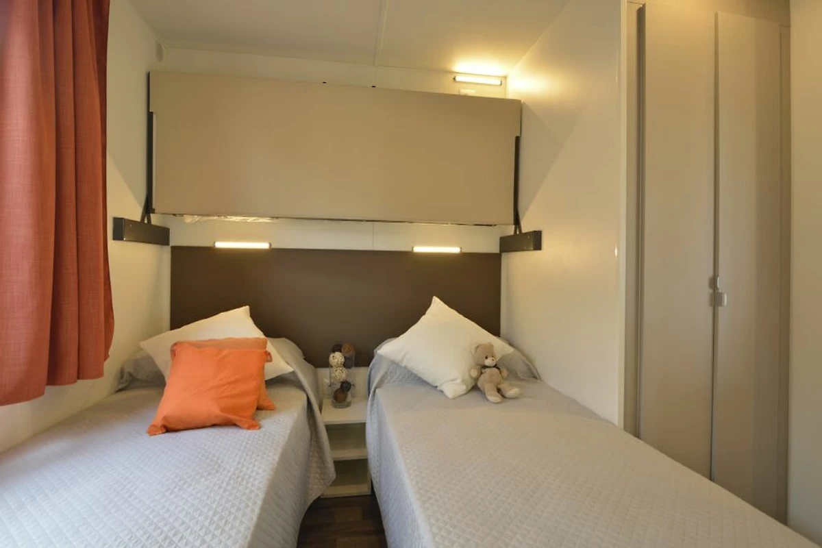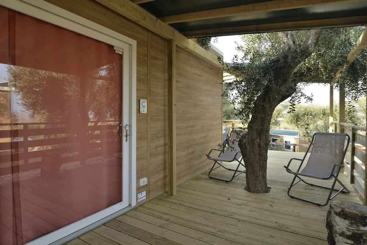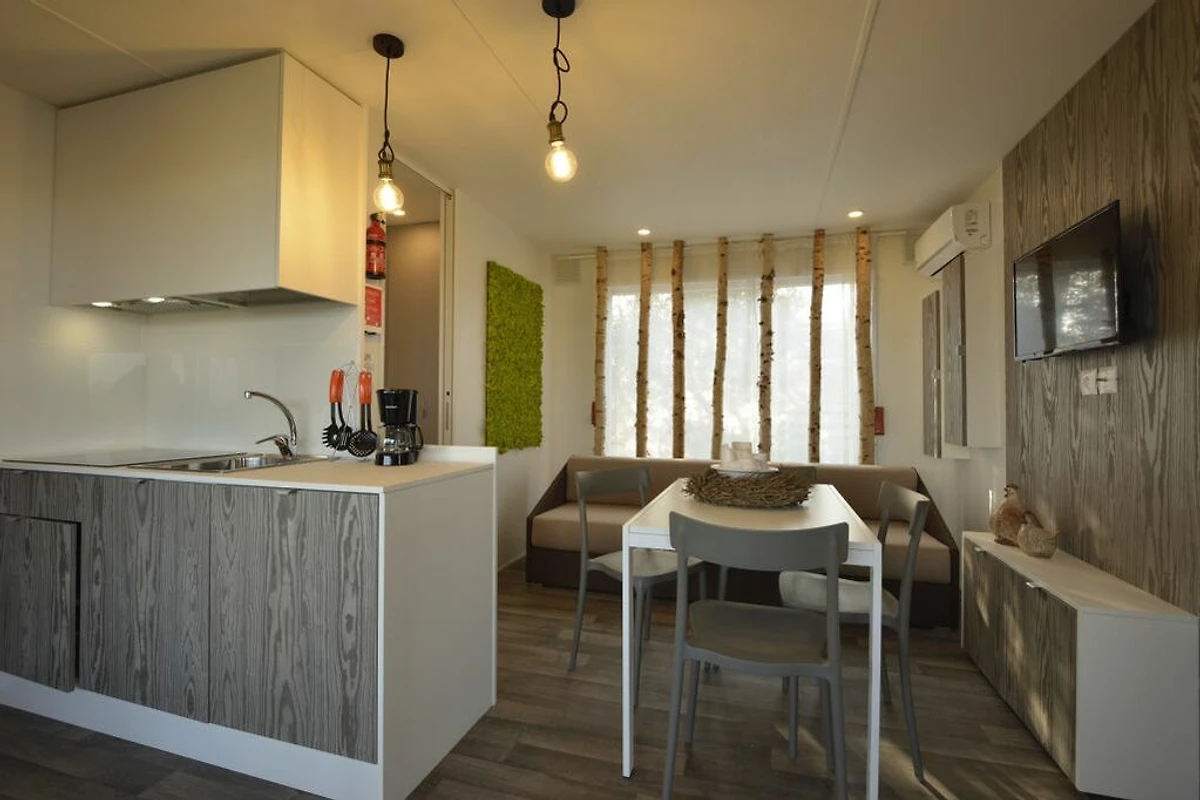 Das schöne Mobilehome Top Hill bietet Platz für 5 Personen. Es liegt an einem Hügel und hat daher eine tolle Aussicht. Es verfügt über ein Schlafzimmer mit einem Doppelbett und einem angeschlossenen Badezimmer mit einer Dusche, einem Waschbecken und einem WC. Das zweite Schlafzimmer verfügt über zwei Einzelbetten sowie ein Hochbett quer darüber (für ein Kind bis max. 150 cm) und auch über ein angeschlossenes Badezimmer mit einer Dusche, einem Waschbecken sowie einem WC. Zudem hat die Unterkunft einen kombinierten Ess- und Wohnbereich, wo man auch die gut ausgestattete Kochnische mit Elektroherd, einen Kühlschrank mit Eisfach, Spüle, Besteck, Geschirr, Töpfen, Pfannen und einer Filterkaffeemaschine findet. Eine überdachte Holzveranda mit Tisch, Stühlen und zwei Liegestühlen, die zum Essen und Verweilen im Freien einlädt, ist auch vorhanden. Bei Bedarf kann ein Gasgrill vor Ort gemietet werden (Elektro- und Kohlegrill sind nicht erlaubt). Fahrzeit ab ital. Grenze ca. 2h. Hinweis: Wenn Sie mehr als eine Unterkunft benötigen, ist dies bei uns in der Regel möglich, da wir über mehrere Objekte des gleichen Wohnungstyps verfügen.
