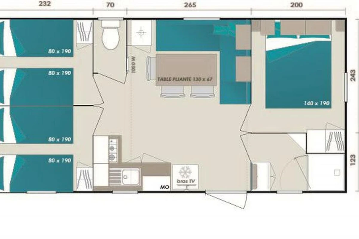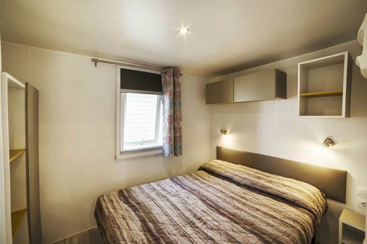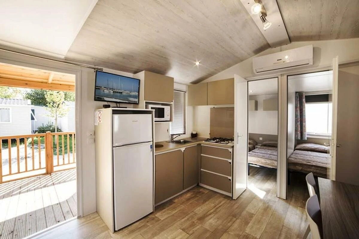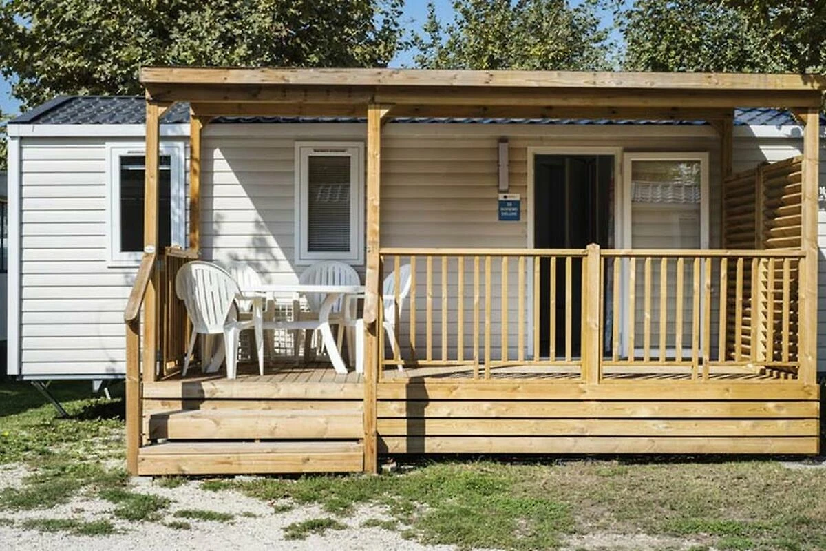 Das neuwertige Mobilehome Boheme Deluxe ist hell und modern eingerichtet. Die Unterkunft bietet Platz für max. 6 Personen. Die Unterkunft besteht aus einem Elternschlafzimmer mit Doppelbett sowie zwei Kinderzimmer mit je zwei Einzelbetten. Die gut eingerichtete Küche befindet sich im Wohnbereich und verfügt über 4-Flammen-Gasherd, Spüle, Besteck, Geschirr, italienische Espressokanne (eine Filterkaffeemaschine kann bei Bedarf gemietet werden), Töpfe, Mikrowelle, Wasserkocher, Toaster sowie einen Kühlschrank mit Eisfach. Das Badezimmer ist mit einer Dusche und einem Waschbecken ausgestattet. Das WC ist separat. Die überdachte Holzterrasse mit Tisch und Stühlen lädt zum gemütlichen Entspannen ein, während die Kinder sich am Pool austoben können. Fahrzeit ab ital. Grenze ca. 2h. Hinweis: Wenn Sie mehr als eine Unterkunft benötigen, ist dies bei uns in der Regel möglich, da wir über mehrere Objekte des gleichen Haustyps verfügen.