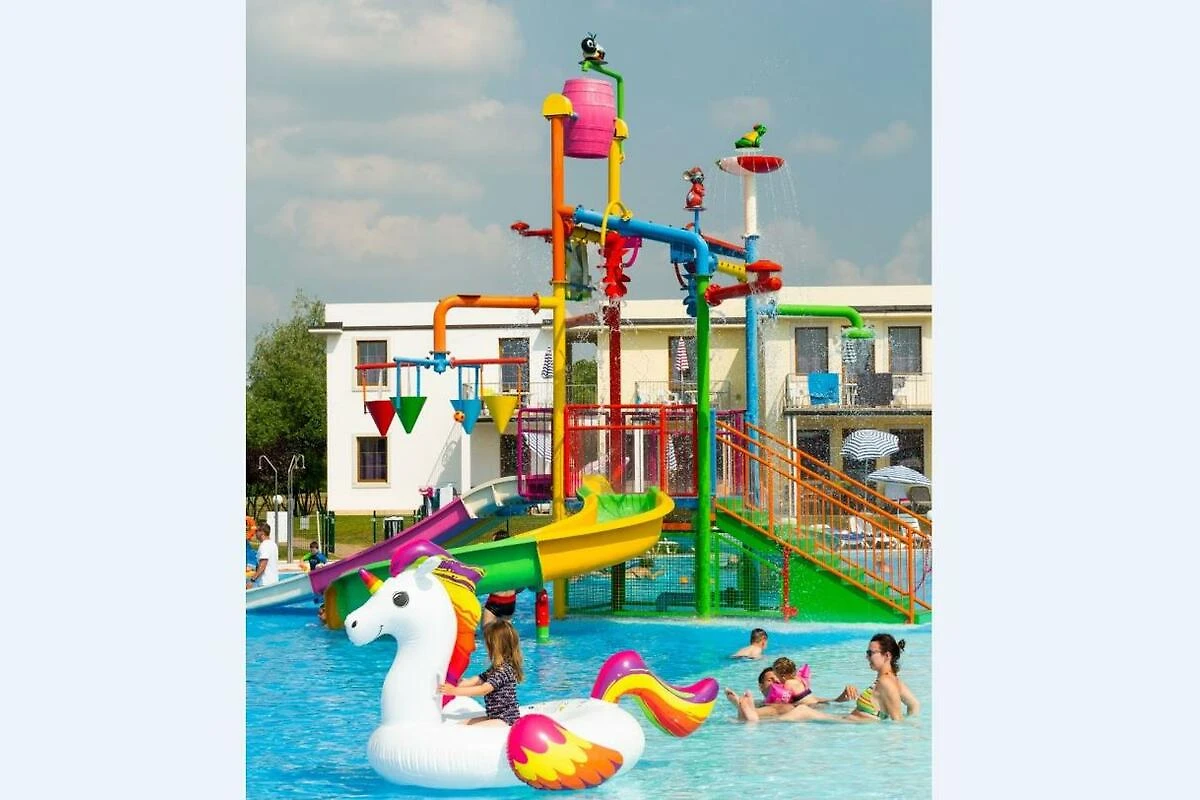 Den Feriengästen steht ein unglaublich toller Lagunenpool mit grossen Liegeflächen, Liegen, Sonnenschirmen und Pavillons zur Verfügung. Der Pool ist umrandet von viel Grünfläche. Für die Kinder gibt es tolle Rutschen sowie Wasserspiele. Der Pool befindet sich in der Mitte der Ferienanlage. Falls Sie Hunger oder Durst bekommen, können Sie sich in der Bar/Restaurant neben dem Pool verpflegen.