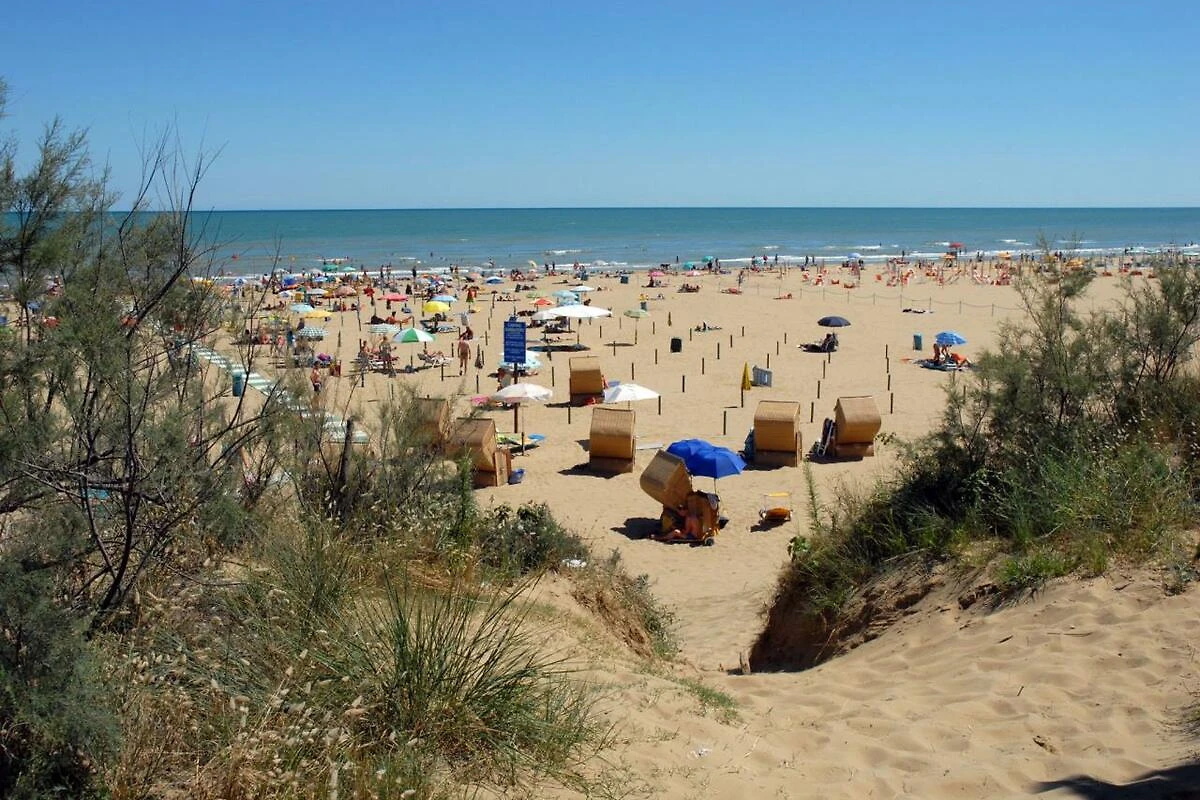 Der in unmittelbarer Fussnähe liegende Sandstrand ist nur für die Ferienanlage-Benutzer. Er ist zum Teil mit Liegen und Sonnenschirmen bestückt, Sie können aber auch Ihre eigenen Stühle mitbringen. Der breite, flachabfallende, goldfarbene Sandstrand eignet sich besonders gut für Familien mit Kleinkindern. Den Gästen stehen Wassersport-Möglichkeiten zur Verfügung: Windsurfen, Kate-Surfen, und Kanu. Ausserdem finden am Strand auch diverse Animationen statt. Der ideale Ort, um sich bei einem Sonnenbad zu entspannen oder sich einer der vielen Sportaktivitäten zu widmen. Ein schneller Imbiss kann im Schatten der Bar Sabbiadoro eingenommen werden, die von morgens bis abends geöffnet ist und ein einladendes, erfrischend leckeres Angebot führt. Am Strand garantieren Gehwege bis zum Küstenstreifen den Zugang mit Kinderwagen Bademeister sorgen den ganzen Tag für Sicherheit.