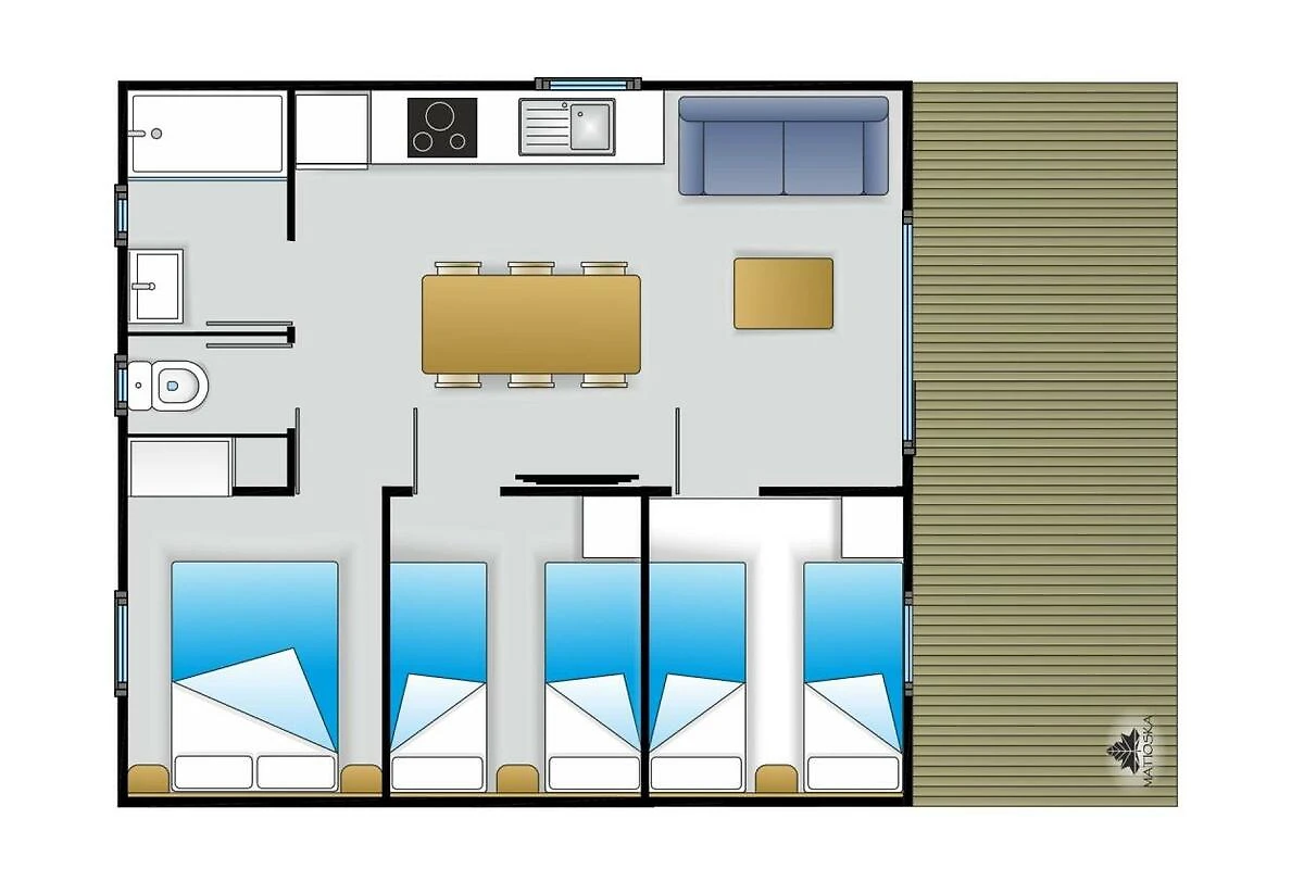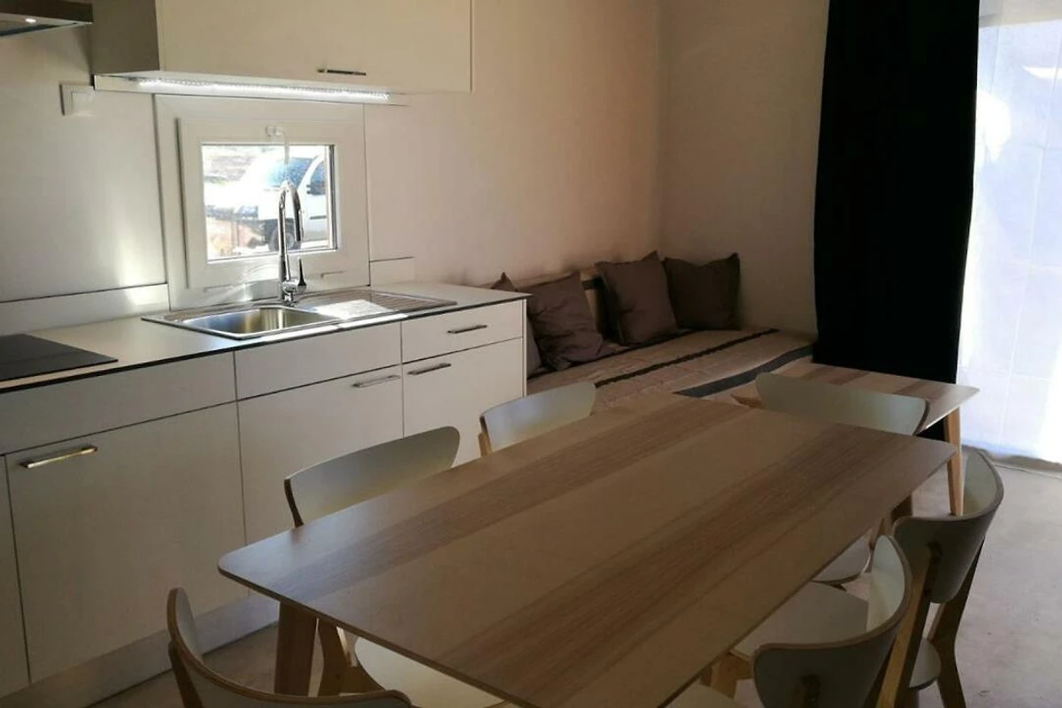 Das helle und geräumige Mobilehome Plus 3AC mit 39 Quadratmetern verfügt über eine moderne Einrichtung und eine einladende Atmosphäre. Die Unterkunft bietet Platz für max. 6 Personen (inkl. Babys) und besteht aus einem Elternschlafzimmer mit Doppelbett sowie zwei weiteren Schlafzimmern mit jeweils zwei Einzelbetten. Im Wohnbereich befindet sich die gut eingerichtete Küche mit Geschirr, Besteck, Töpfen, einem Vitrokeramik – Herd mit vier Kochfeldern, einer Mikrowelle, einer Kaffeemaschine, einem Wasserkocher sowie einem grossen Kühlschrank mit Eisfach. Das Badezimmer ist mit einer Dusche, einem Waschbecken und einem Föhn ausgestattet, das WC ist separat. Der Sitzplatz mit einer Pergola, Tisch und Stühlen lädt zum gemütlichen Entspannen ein, während die Kinder sich auf dem Spielplatz oder am Pool austoben können. Grillen mit einem mitgebrachten Grill (Holzkohle) ist ebenfalls erlaubt. Optional steht WIFI zur Verfügung. Fahrzeit ab der spanischen Grenze ca. 1h. Hinweis: Wenn Sie mehr als eine Unterkunft benötigen, ist dies bei uns in der Regel möglich, da wir über mehrere Objekte des gleichen Haustyps verfügen.