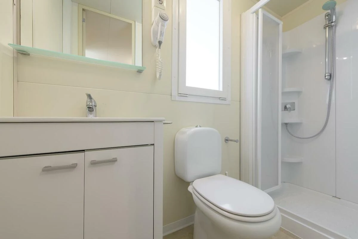 Das Mobilehome Standard Plus 8x3 verfügt über ein Schlafzimmer mit Ehebett und einem eigenen Badezimmer mit Dusche, WC und Waschbecken. Das zweite Zimmer verfügt über 2 Einzelbetten sowie ein Hochbett für ein Kind bis ca. 12 Jahre und ebenfalls ein eigenes Badezimmer mit Dusche, WC und Waschbecken. Die gut eingerichtete Küche im Wohnzimmer ist mit Kochtöpfen, Geschirr, Besteck und Kühlschrank mit Eisfach ausgestattet. Das Mobilehome verfügt zudem über Klimaanlage und SAT-TV. Der überdachte Sitzplatz mit Tisch und Stühlen lädt zum gemütlichen Entspannen ein, während die Kinder sich auf dem Spielplatz oder am Pool austoben können. Kissen und Decken sind vorhanden. Grillen ist erlaubt. Fahrzeit ab ital. Grenze ca. 2h. Hinweis: Wenn Sie mehr als eine Unterkunft benötigen, ist dies bei uns in der Regel möglich, da wir über mehrere Objekte des gleichen Haustyps verfügen.