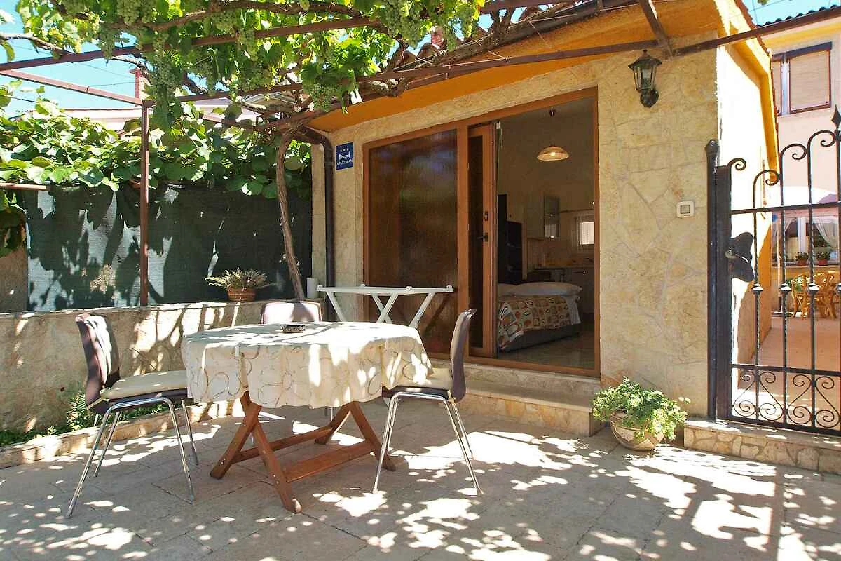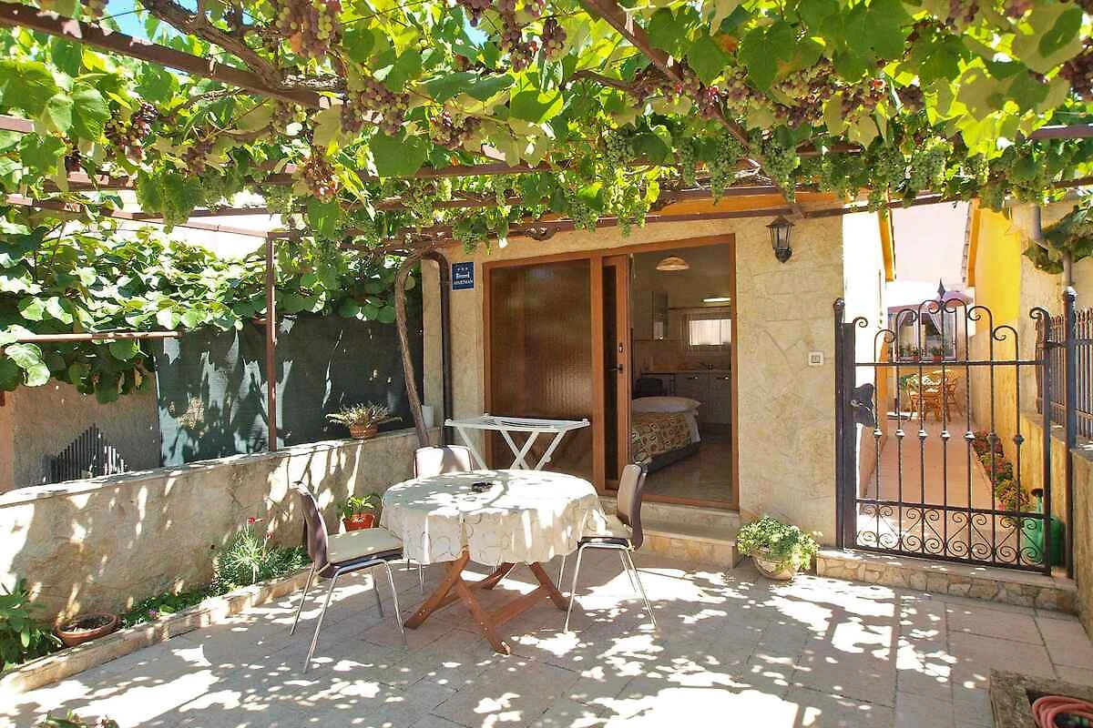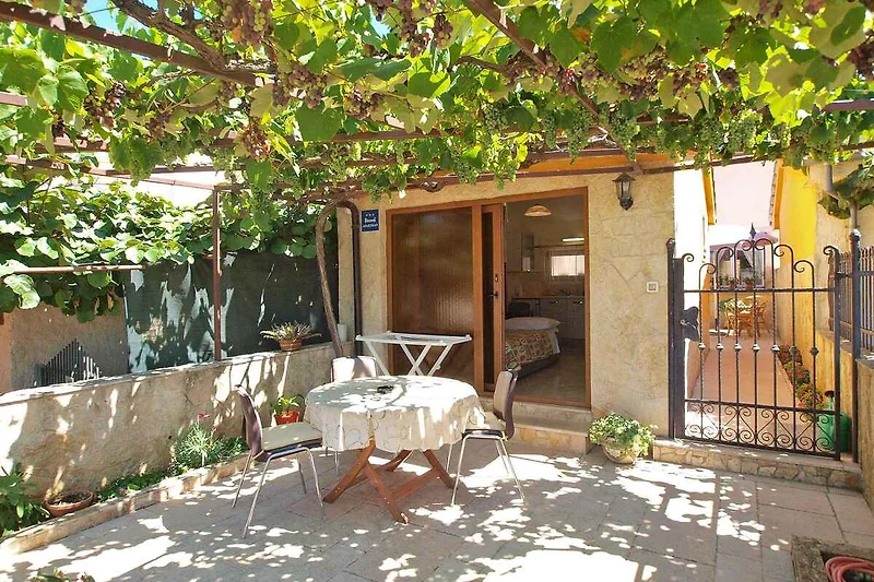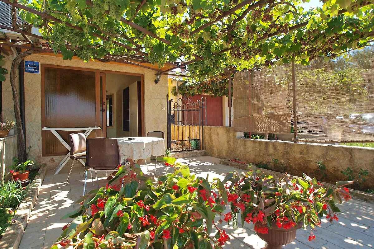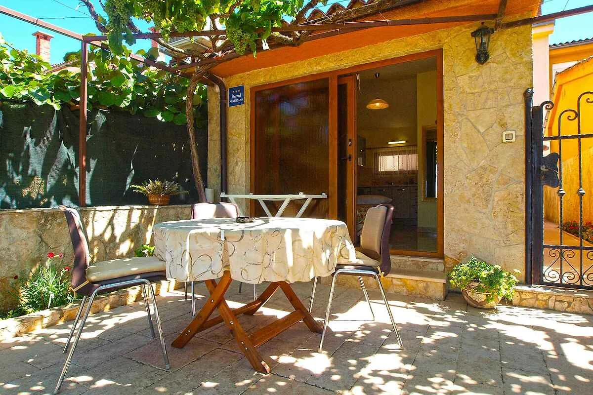 Pula. Die Ferienwohnung befindet sich auf einem 20 qm grossen, geschlossenen Gartengrundstück mit Blumen und Bäumen, von einem Zaun begrenzt. Die Zufahrt erfolgt über eine Nebenstrasse (asphaltiert). Parkplatz auf dem Grundstück.