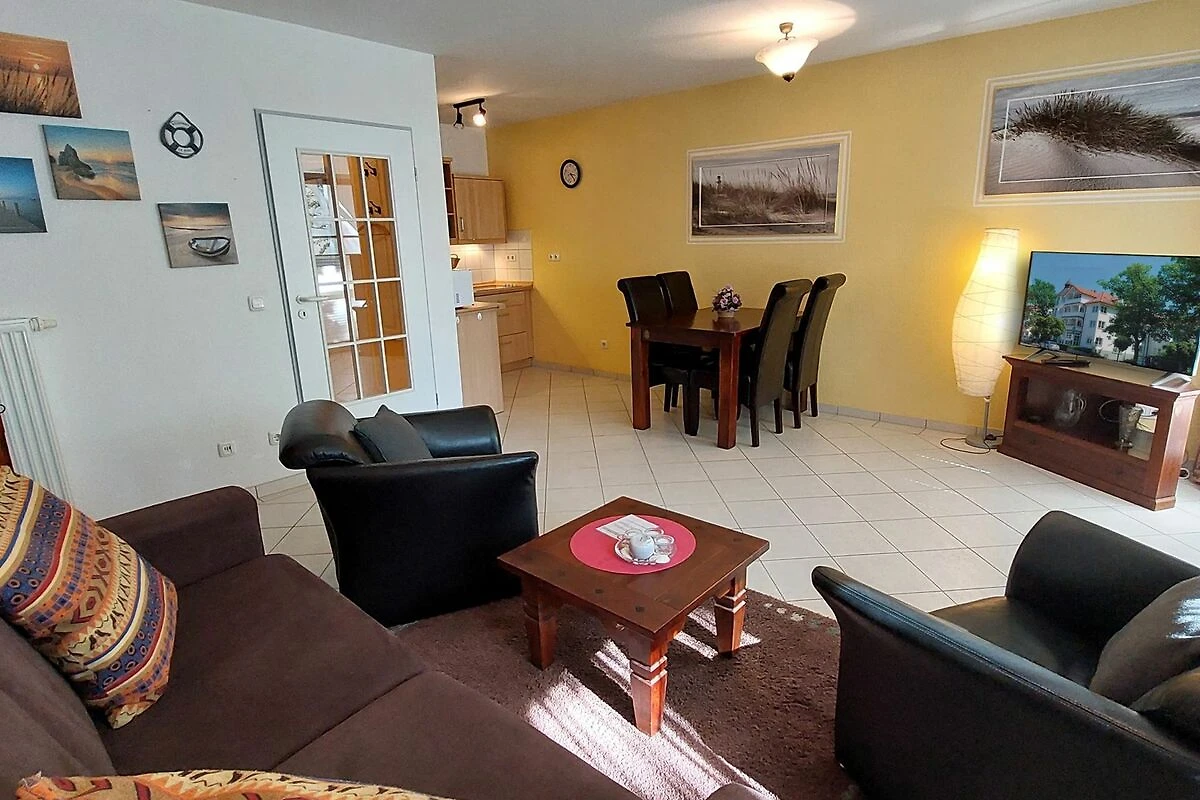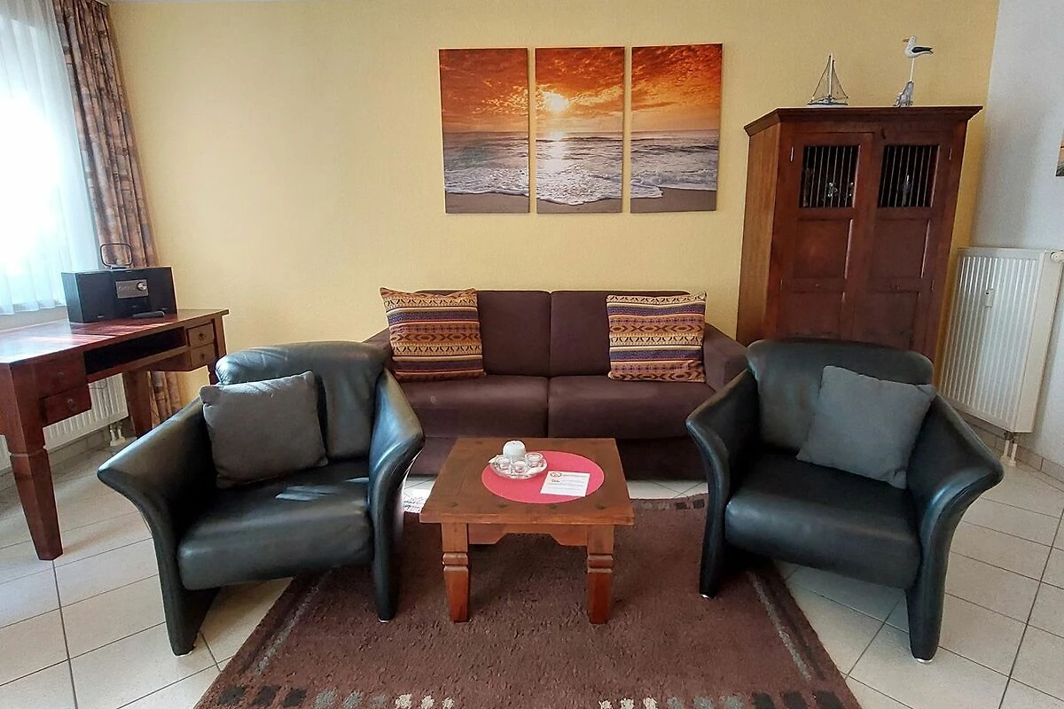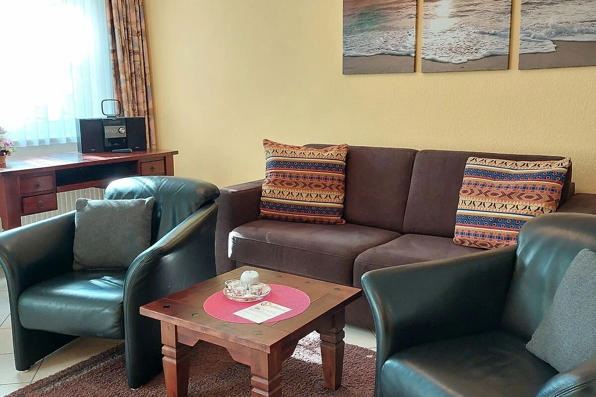 Im hellen Wohnbereich gibt eins eine gemütliche Sitzlandschaft mit 2 Sessel und einem Sofa (mit Schlaffunktion). Zu technischen Ausstattung gehört ein moderner Smart-TV und eine Stereoanlage.