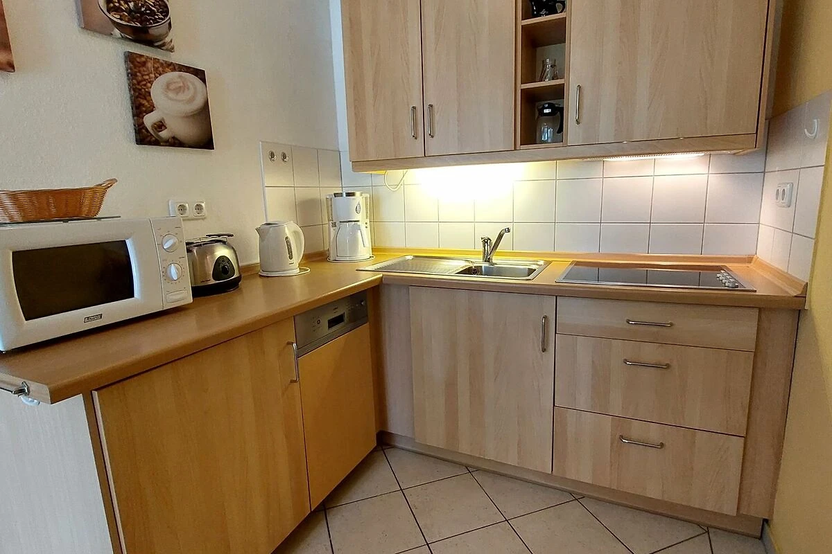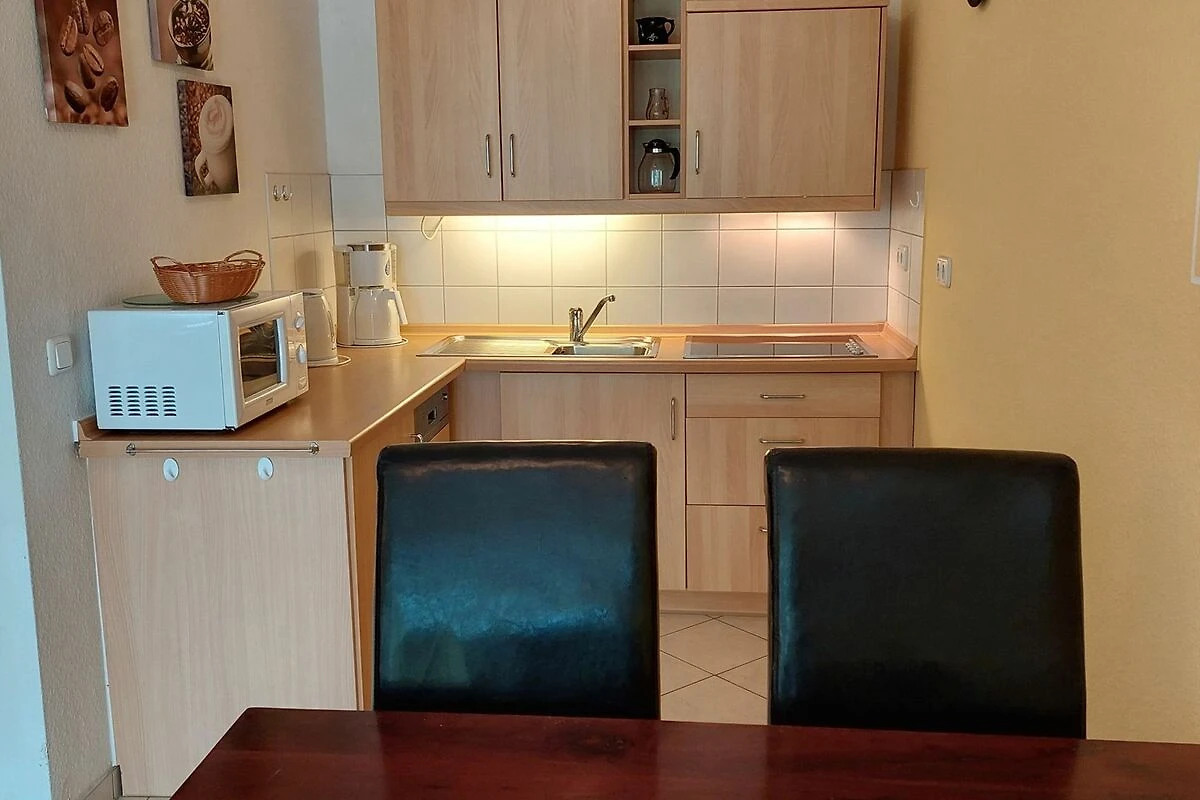 Der offene Ess- und Kochbereich umfasst einen Esstisch mit 4 Sitzgelegenheiten und eine Kochzeile samt Cerankochfeld, Geschirrspüler, Kühlschrank, Mikrowelle und vielen weiteren Küchenhelfern.