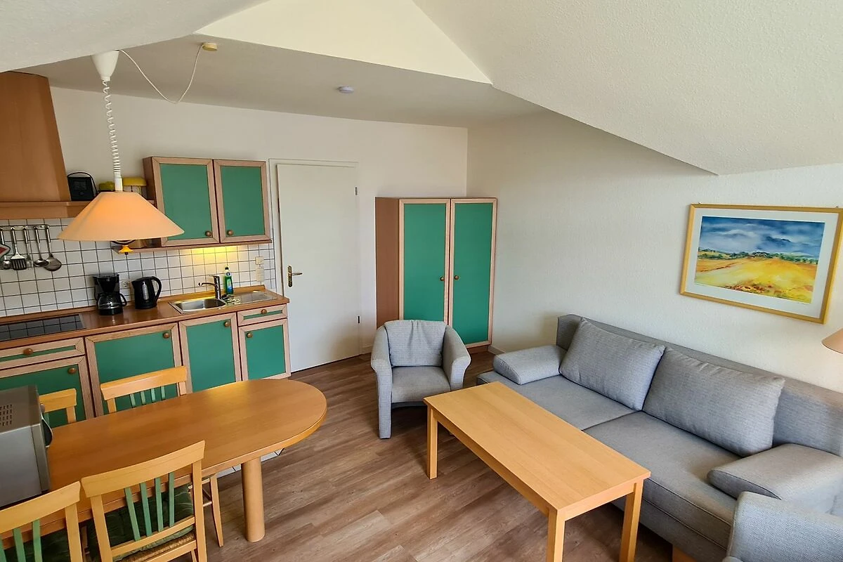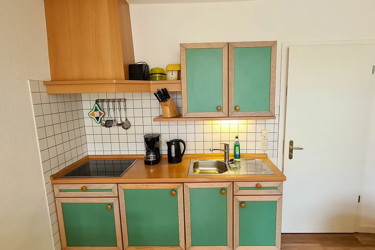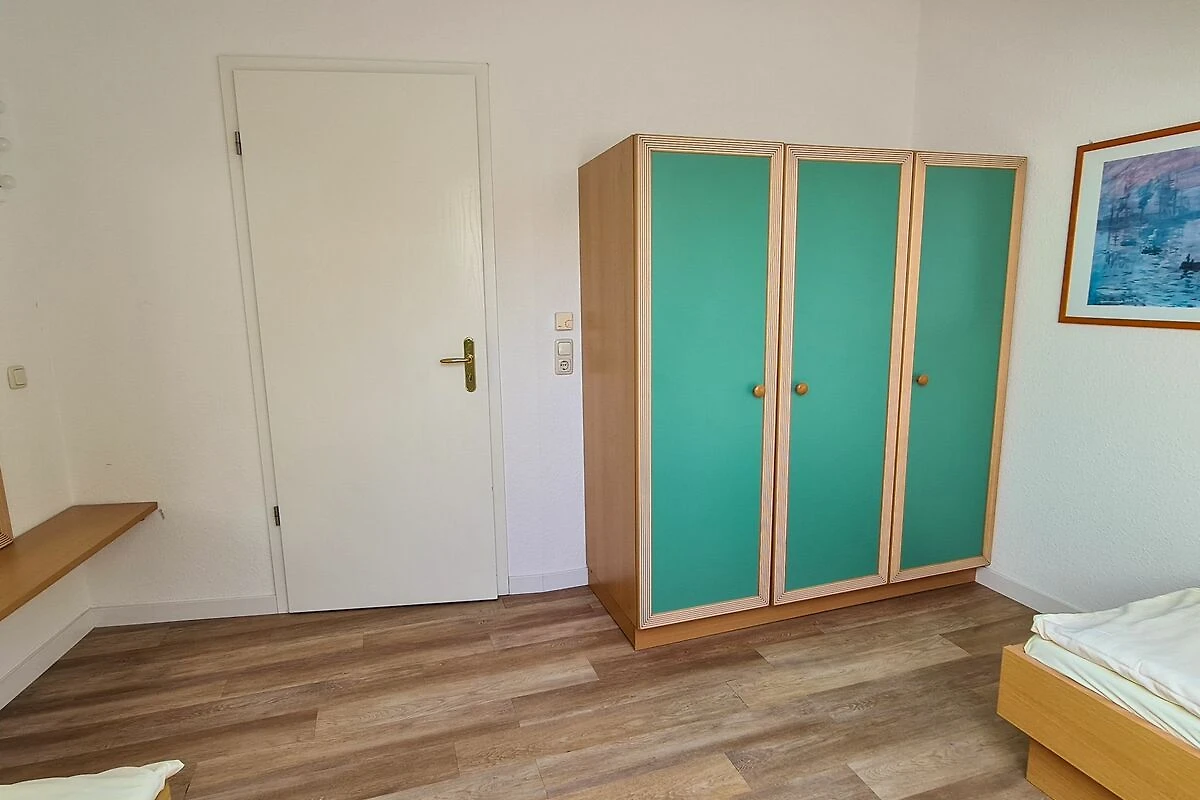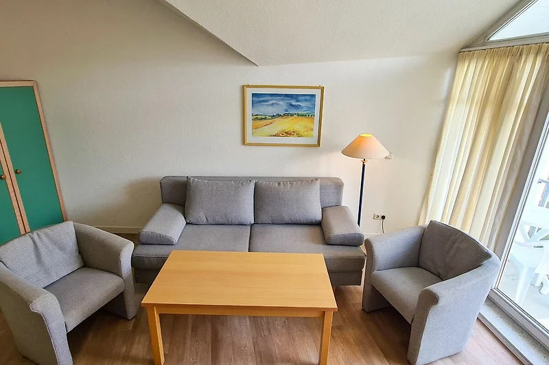 Die Wohnung verfügt über ein Schlafzimmer mit zwei Einzelbetten, Kleiderschrank und ein Wohnzimmer mit mit Sitzecke (Doppelschlafsofa) , TV und Essecke. Eine komplett eingerichtete Küchenzeile (4-Plattenherd, Kühlschrank, Mikrowelle, Kaffeemaschine, Toaster, komplett Geschirr, etc.) als auch ein Bad mit Dusche und WC gehören zur Wohnung.