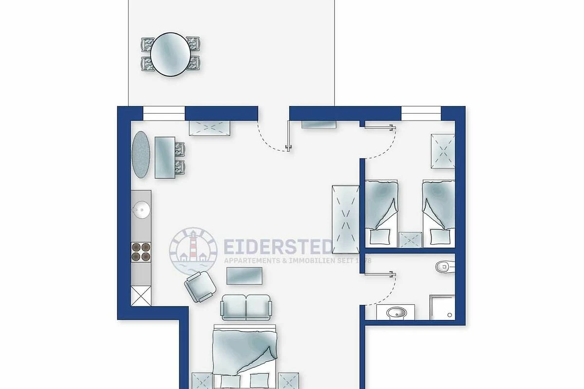 Wohn- und Schlafzimmer mit Sofa, Sessel, SMART-TV, Esstisch mit Sitzbank und 2 Stühlen, Doppelbett (160x200cm, Boxspring) und Kleiderschränken. Offene Küche mit Backofen, Geschirrspüler und Kühlschrank (Gefriermöglichkeit im Gemeinschaftsraum). Direkter Zugang zur möblierten Terrasse nach Norden mit Dünengras-Wall.