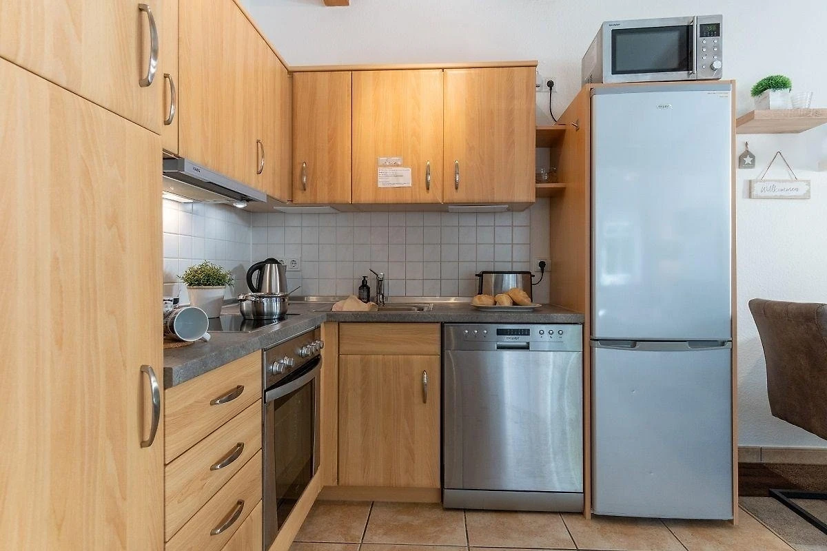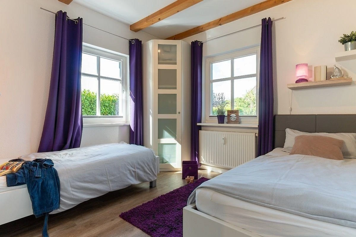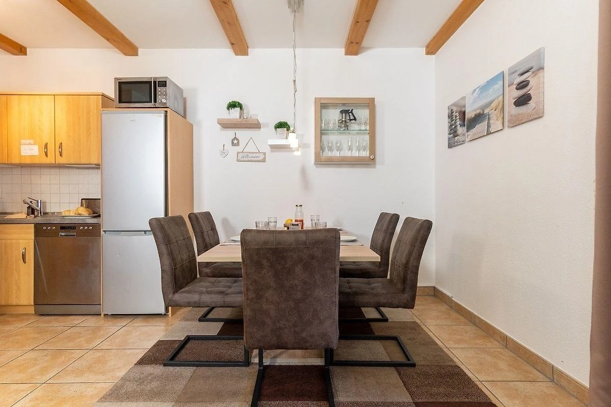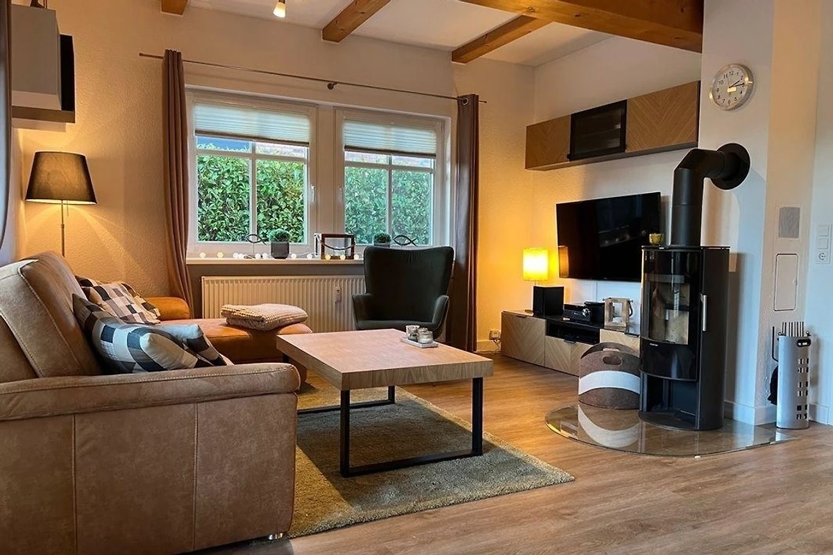 Der sonnige Wohnbereich ist mit einer gemütlichen Sofaecke, Flatscreen-TV und Gesellschaftsspielen ausgestattet. Für eine muckelige Atmosphäre an Schietwettertagen sorgt ein Holzofen. Der angrenzende, offene Küchenbereich ist, für den Urlaubsbedarf, voll ausgestattet. Zusätzlich stehen Ihnen noch ein Backofen, eine Mikrowelle und ein Geschirrspüler zur Verfügung. Das grosse Schlafzimmer verfügt über ein komfortables Doppelbett (2*90*200cm) und das Kinderzimmer wurde mit zwei Einzelbetten, sowie einem Kinderreisebett ausgestattet. Ein kostenfreier Kinderhochstuhl steht Ihnen ausserdem für Ihren Aufenthalt zur Verfügung.