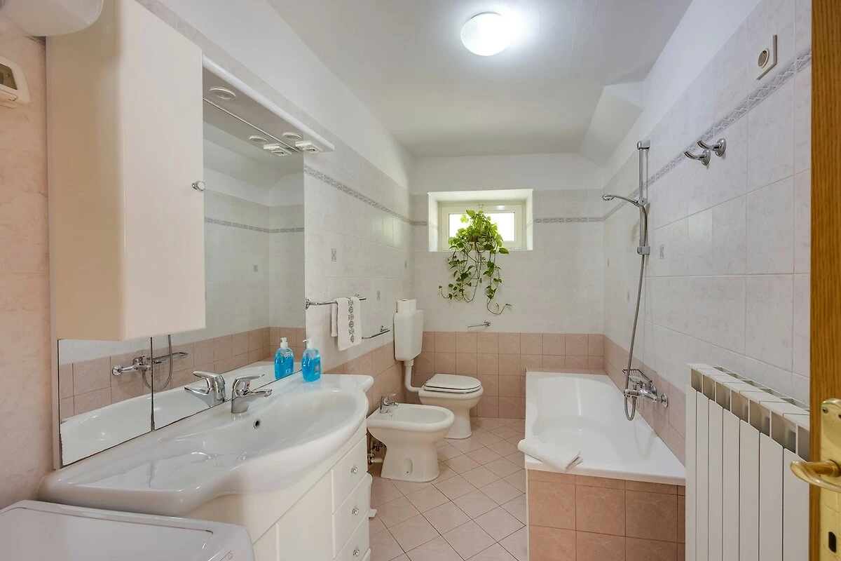 Wohnzimmer mit Sitzecke, TV, Kamin und Zugang zur Terrasse. 3 Schlafzimmer jeweils mit 1 Doppelbett. Schlafzimmer mit 1 Doppelbett und Zugang zum Balkon. Küche mit Essecke (4 Plätze), Elektroherd (2 Platten), Backofen, Kühlschrank, Kaffeemaschine und (Sommerküche). Küche mit Essecke (8 Plätze), Gasherd (4 Flammen), Backofen, Dunstabzugshaube, Geschirrspüler, Kühlschrank (Eisfach), Kaffeemaschine und Toaster. Bad mit Dusche, 1 Waschbecken, WC, Bidet und Fenster. Bad mit Waschmaschine, Dusche, 1 Waschbecken, WC und Fenster. Bad mit Dusche, 1 Waschbecken, WC und Fenster. Separates WC mit 1 Waschbecken und WC.
